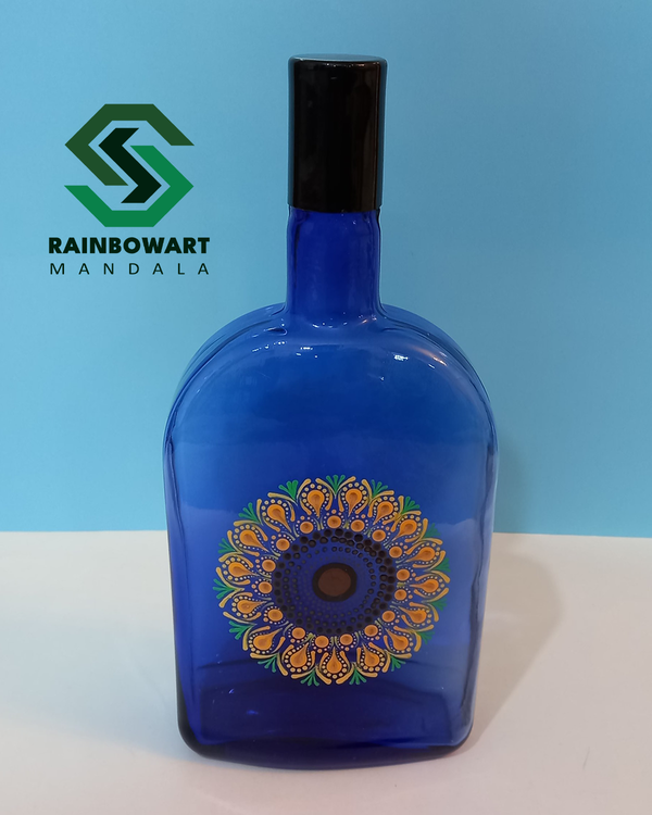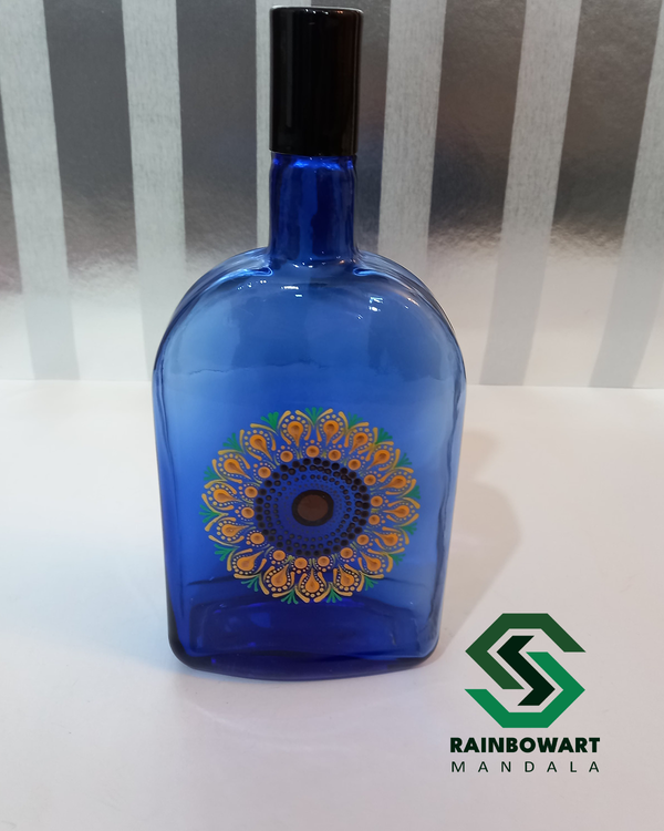 بطری شیشه ای آبی آفتابگردون | طرح ماندالا و دات ماندالا