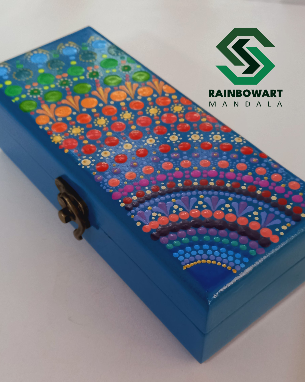 جعبه جاعینکی آبی با طرحهای رنگین کمانی | طرح ماندالا و دات ماندالا
