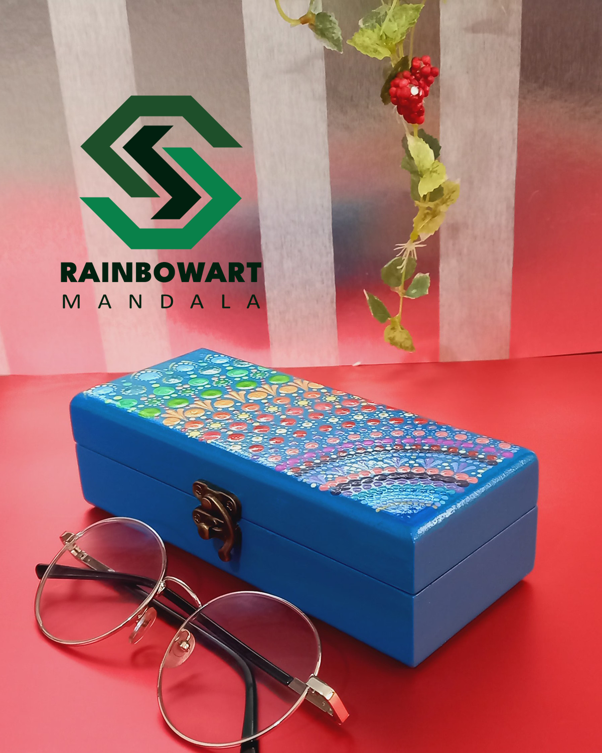 این جعبه جاعینکی چوبی با رنگ بدنه آبی و قفل فلزی، با دقت بالا و ظرافت در جزئیات ساخته شده و جلوهای هنری و چشمنواز دارد. نقوش رنگینکمانی دات ماندالا و ماندالا روی سطح جعبه، کاملاً بر اساس سفارش مشتری و با رنگهای انتخابی او اجرا شدهاند. نتیجهی کار، جعبهای خاص، منحصربهفرد و کاملاً هماهنگ با سلیقهی مشتری شده است.