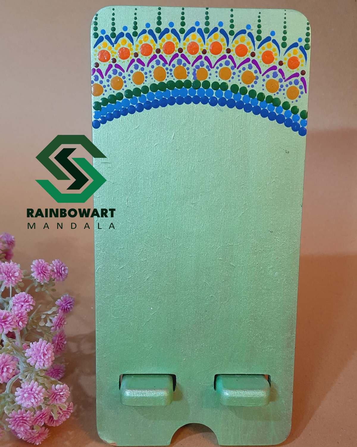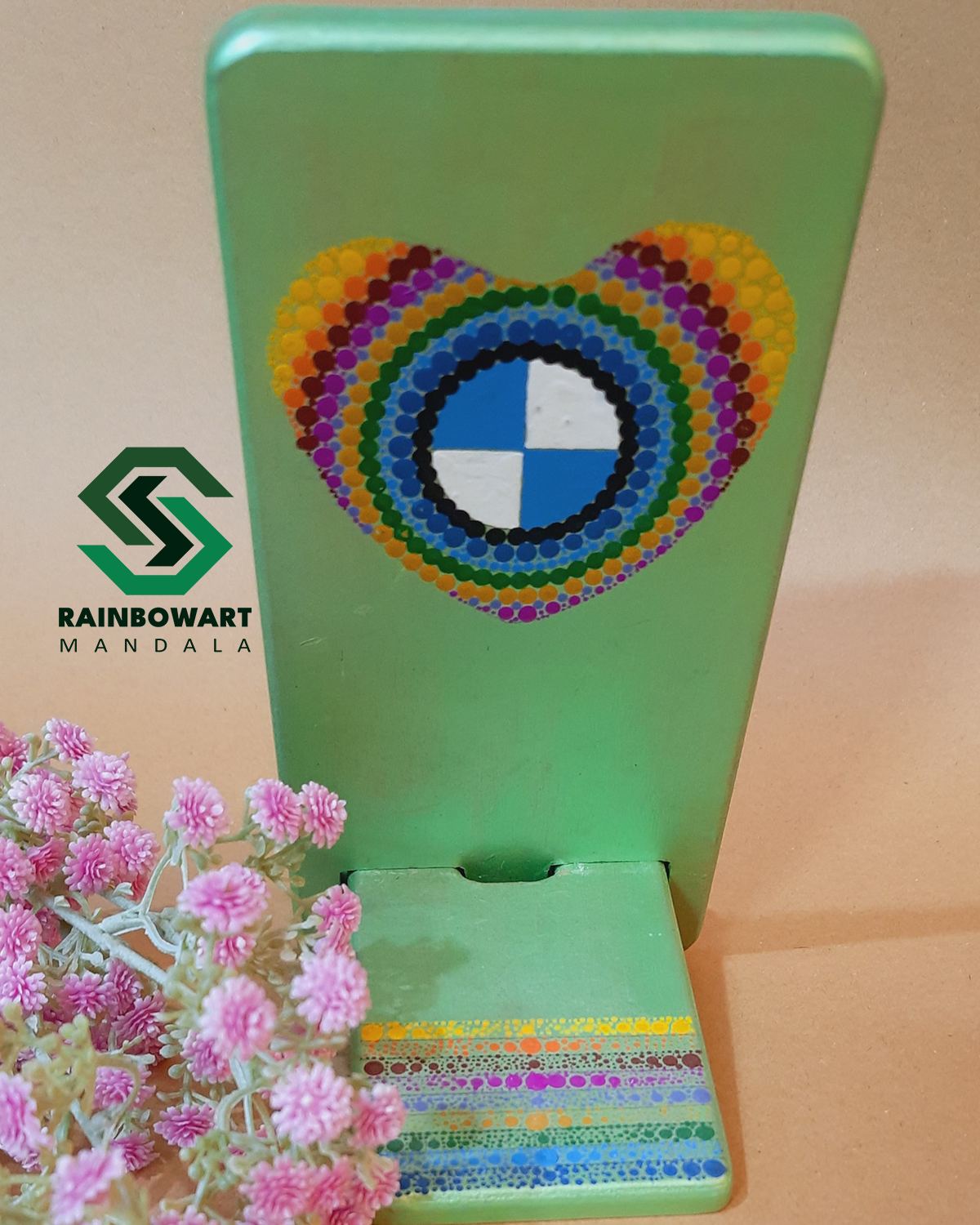 هولدر موبایل چوبی سبز با لوگوی بی ام دبلیو | طرح ماندالا و دات ماندالا