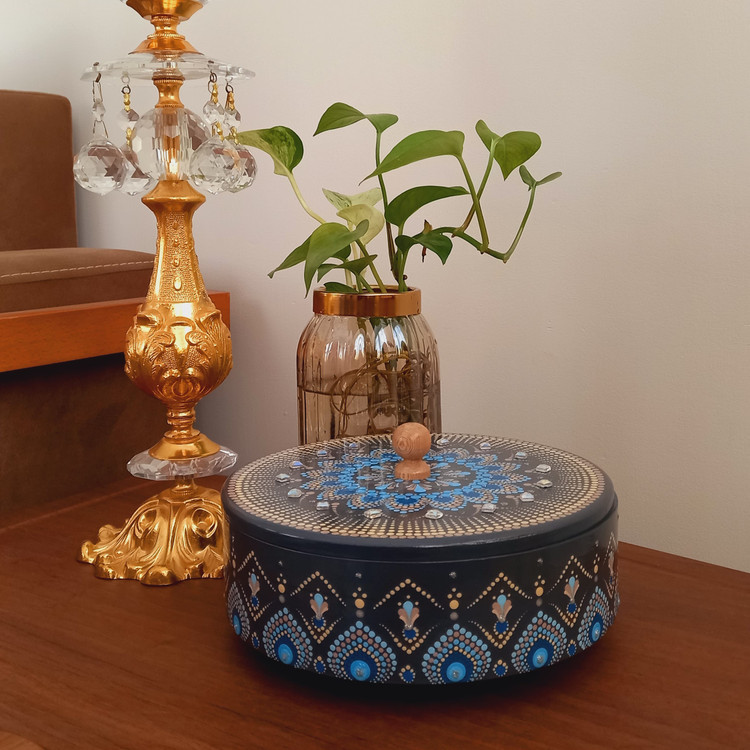 این آجیلخوری چوبی با بدنهای به رنگ طوسی مات و نقوش نقطهکوبیشده در طیفهای متنوع آبی، انتخابی ایدهآل برای کسانیست که به دکورهای آرام، خنک و در عین حال خاص علاقه دارند. ترکیب رنگهای سرد و طراحی ظریف ماندالا و داتماندالا، حالوهوایی آرامبخش و هنری به این ظرف داده است.