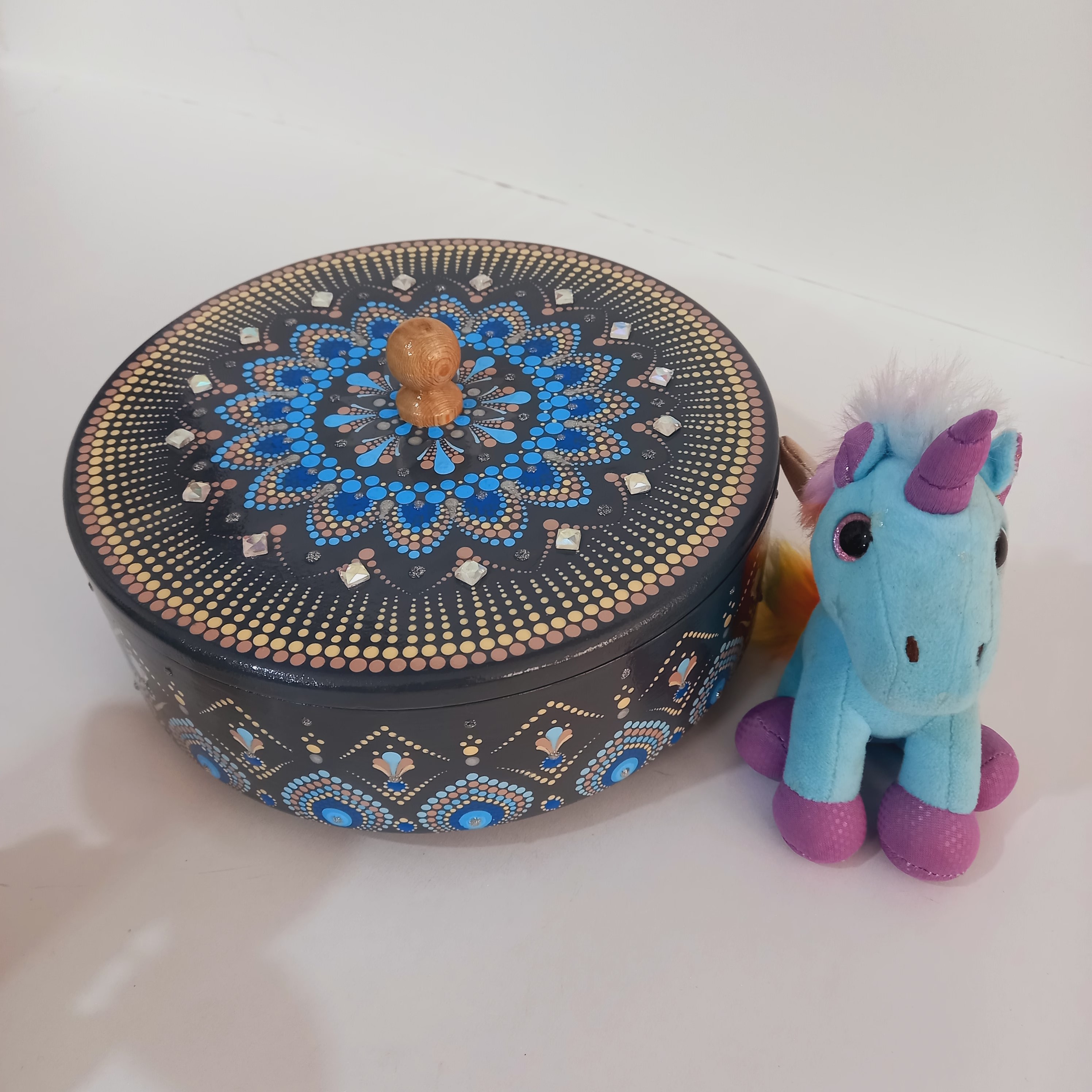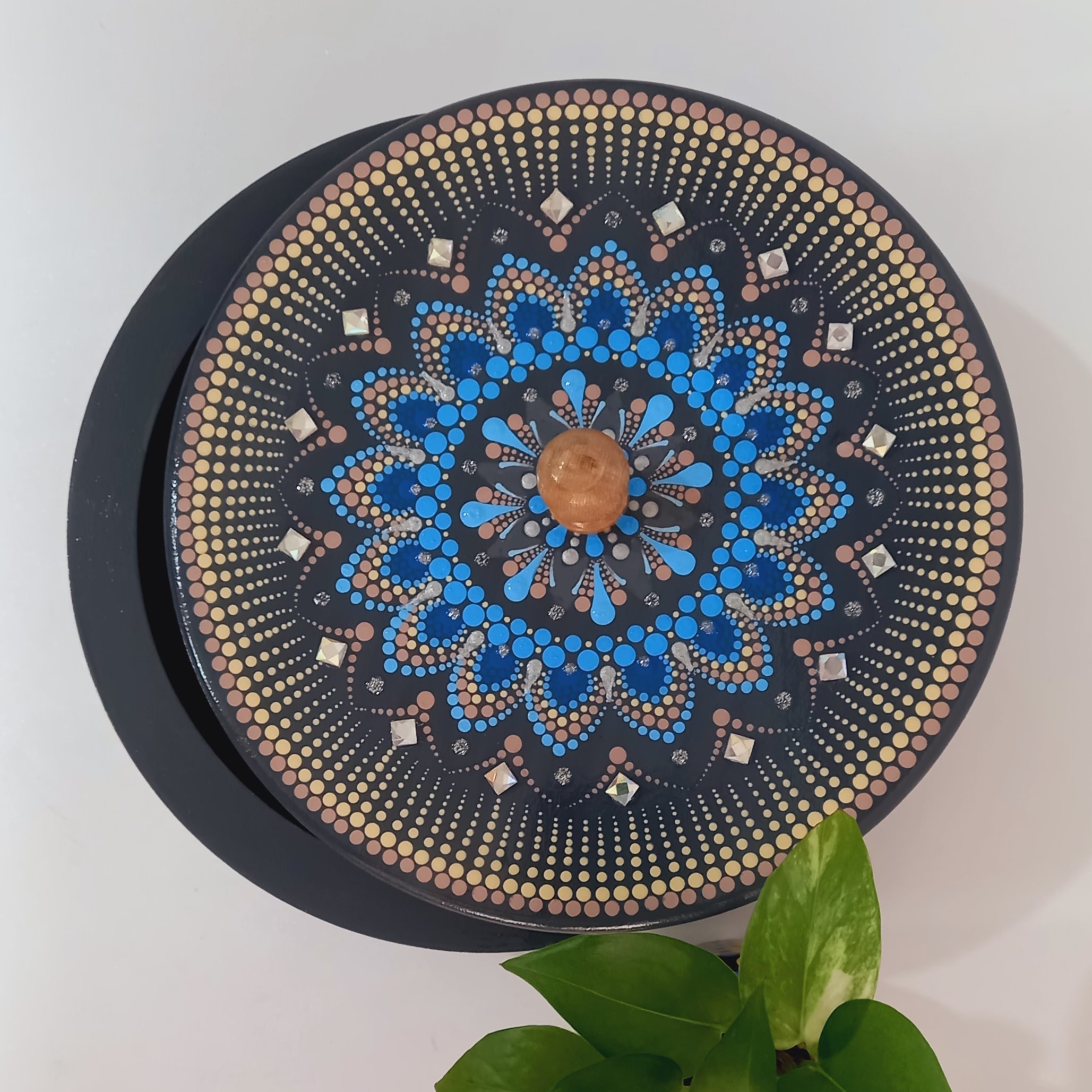 این آجیلخوری چوبی با بدنهای به رنگ طوسی مات و نقوش نقطهکوبیشده در طیفهای متنوع آبی، انتخابی ایدهآل برای کسانیست که به دکورهای آرام، خنک و در عین حال خاص علاقه دارند. ترکیب رنگهای سرد و طراحی ظریف ماندالا و داتماندالا، حالوهوایی آرامبخش و هنری به این ظرف داده است.