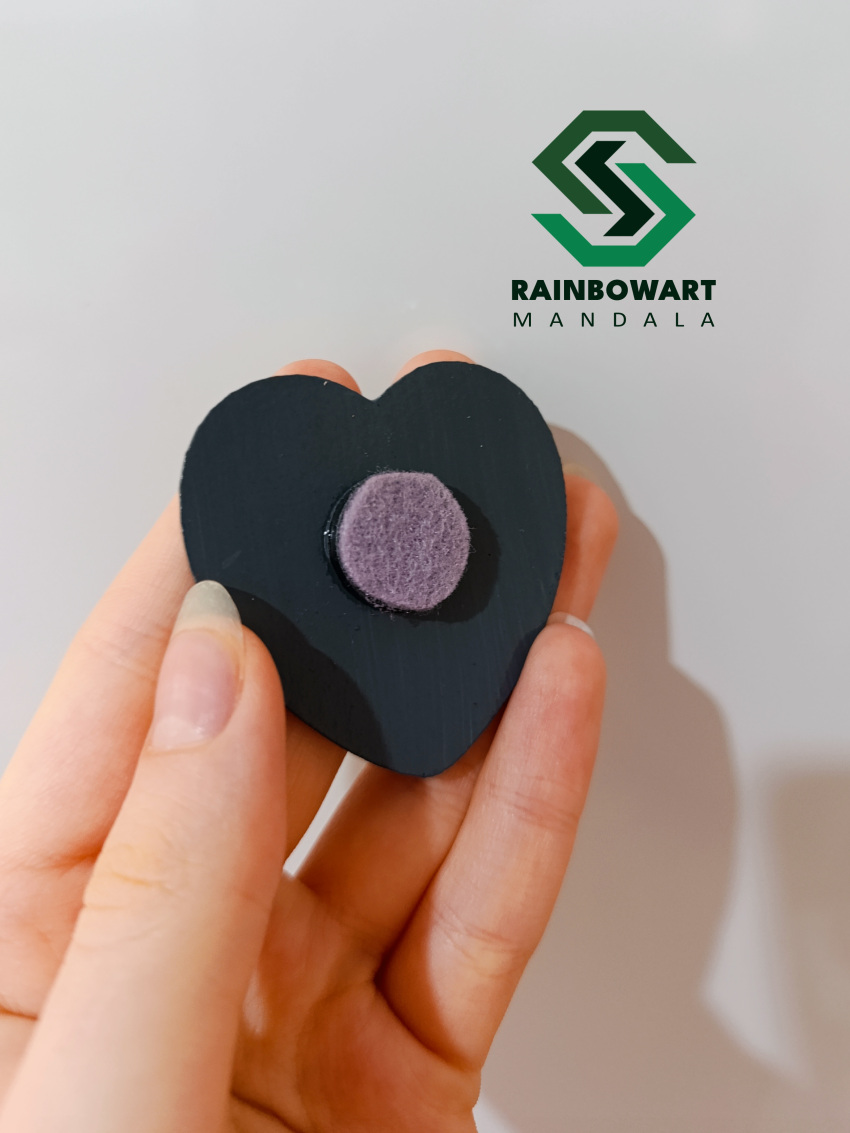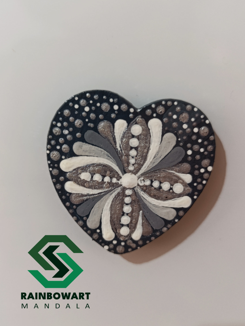 مگنت چوبی قلبیشکل با رنگ طوسی، تزئینشده با نقوش ماندالا و دات ماندالا به طیفهای نقرهای و طوسی، یک انتخاب زیبا برای تزئین یخچال یا دیگر سطوح فلزی است.