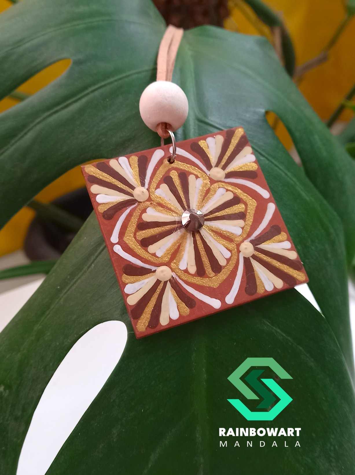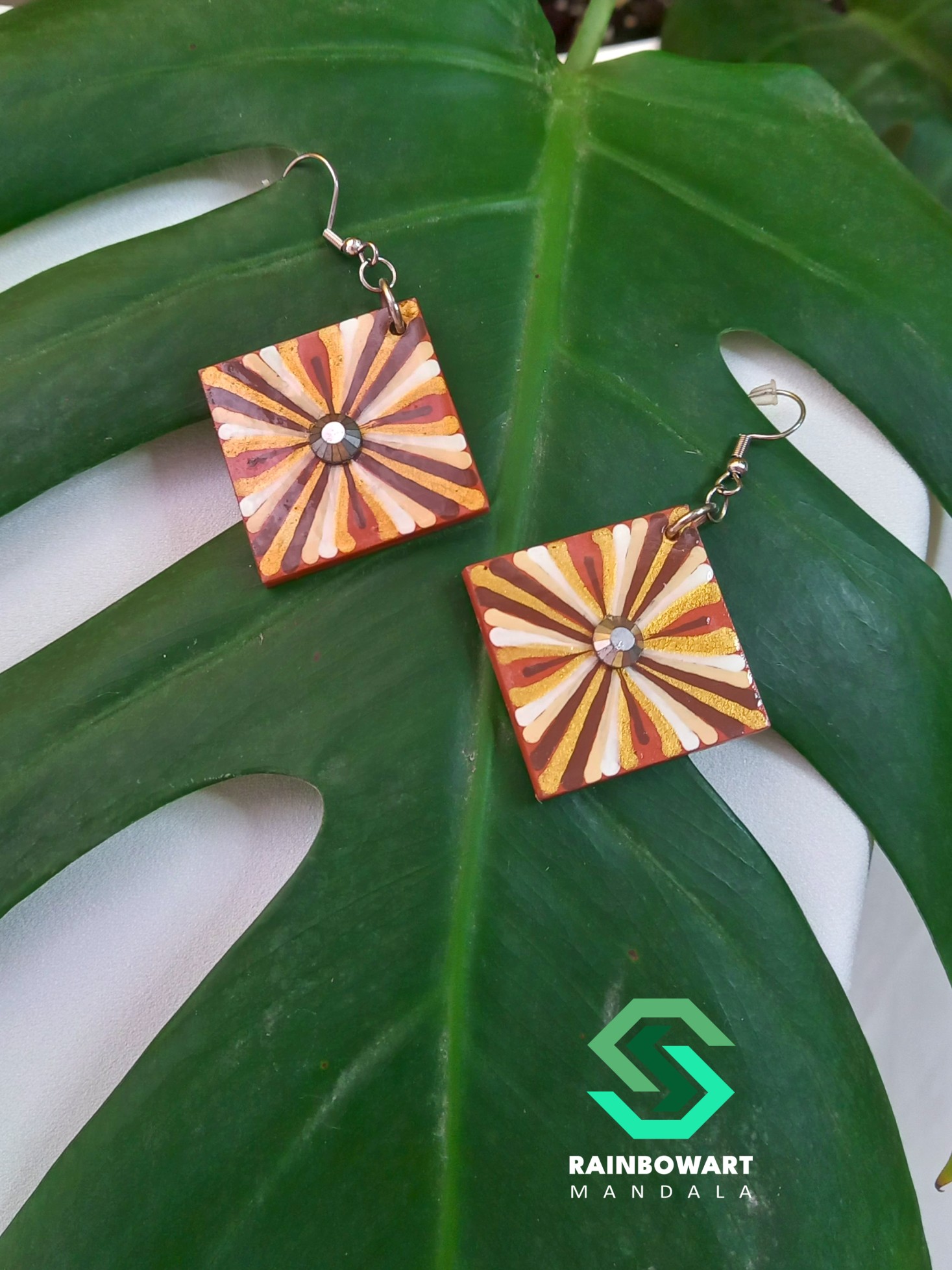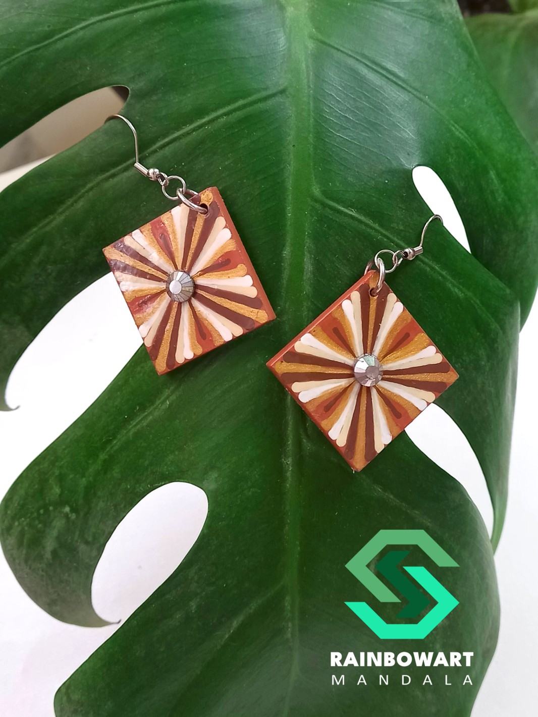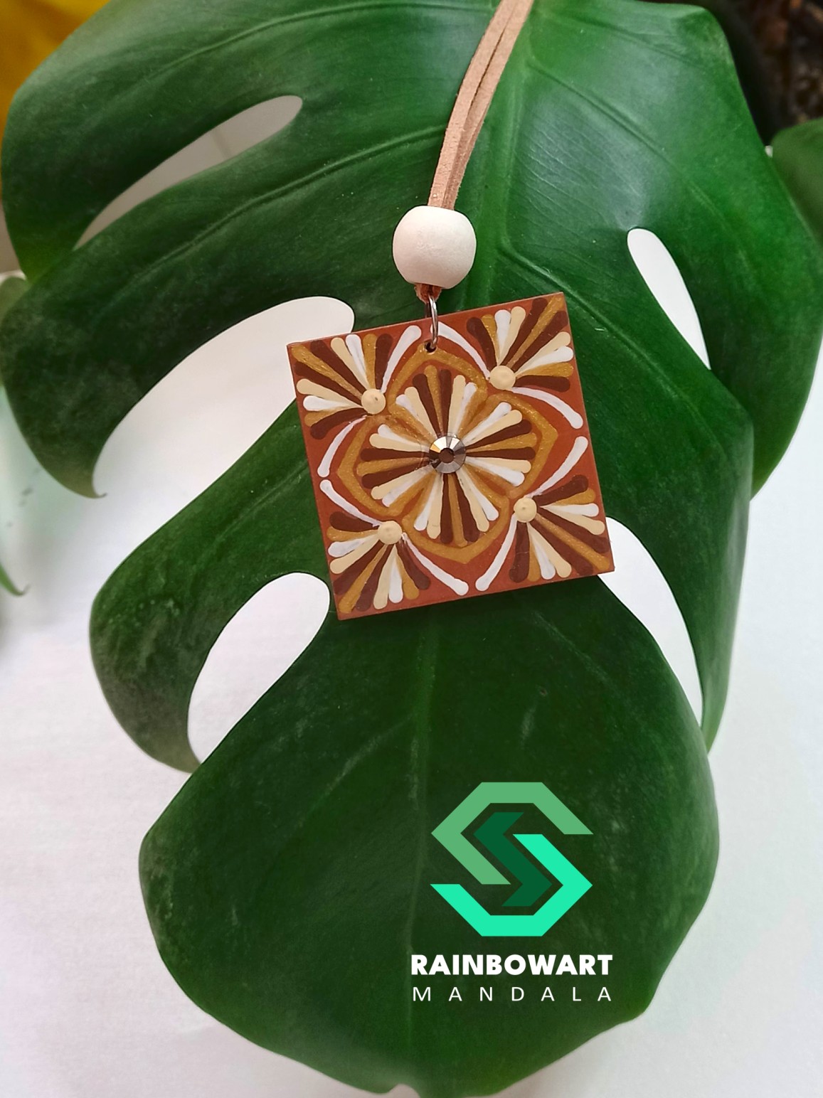 ست گردنبند و گوشواره مربعی قهوه ای و کرم | طرح ماندالا و دات ماندالا