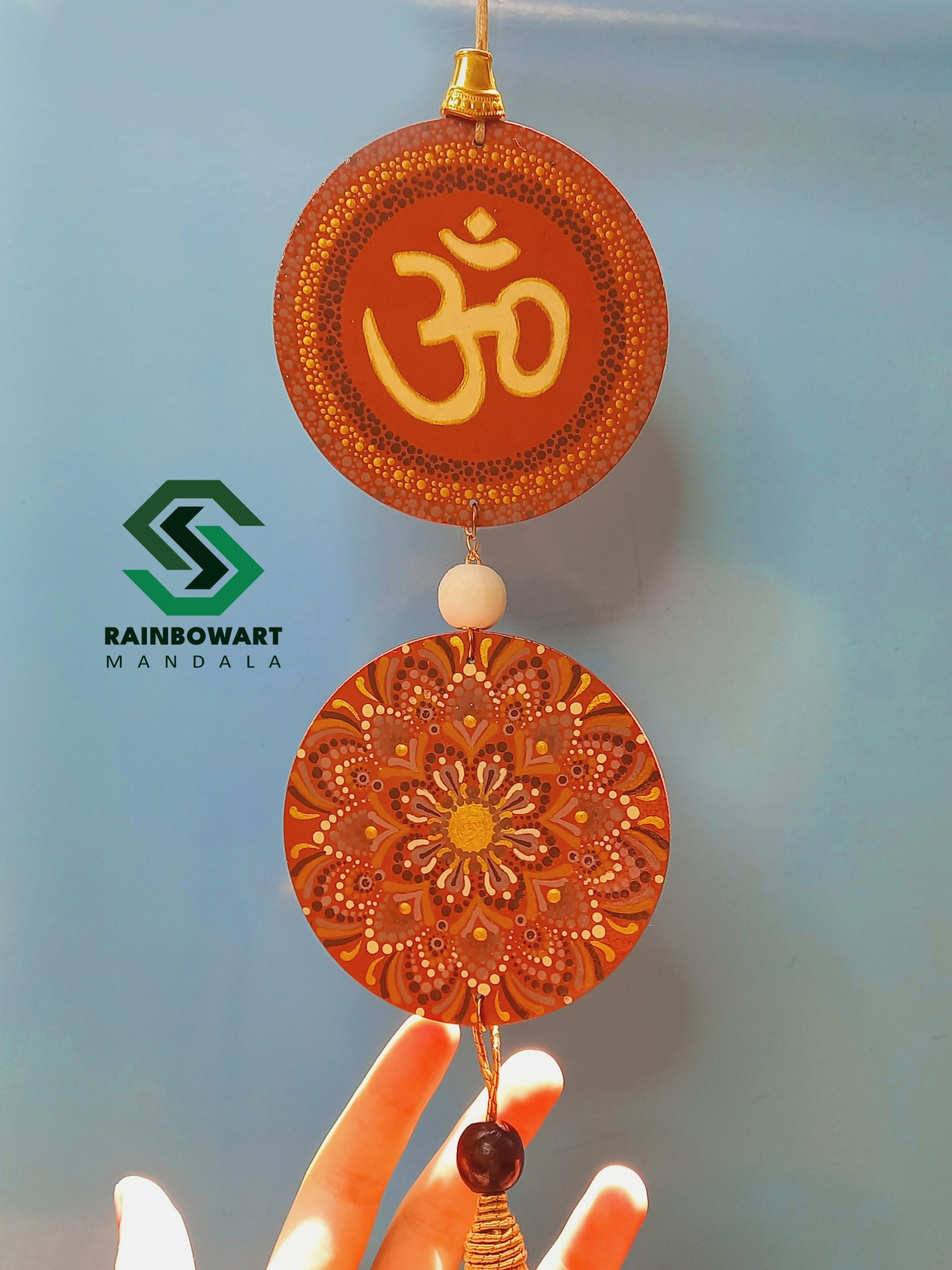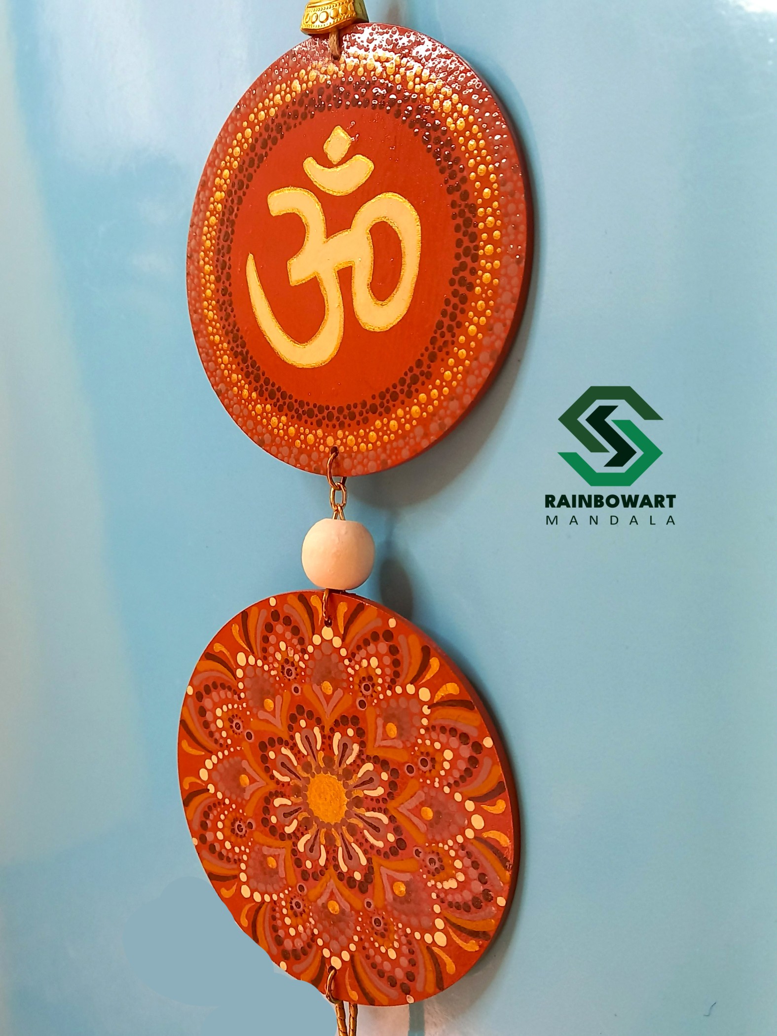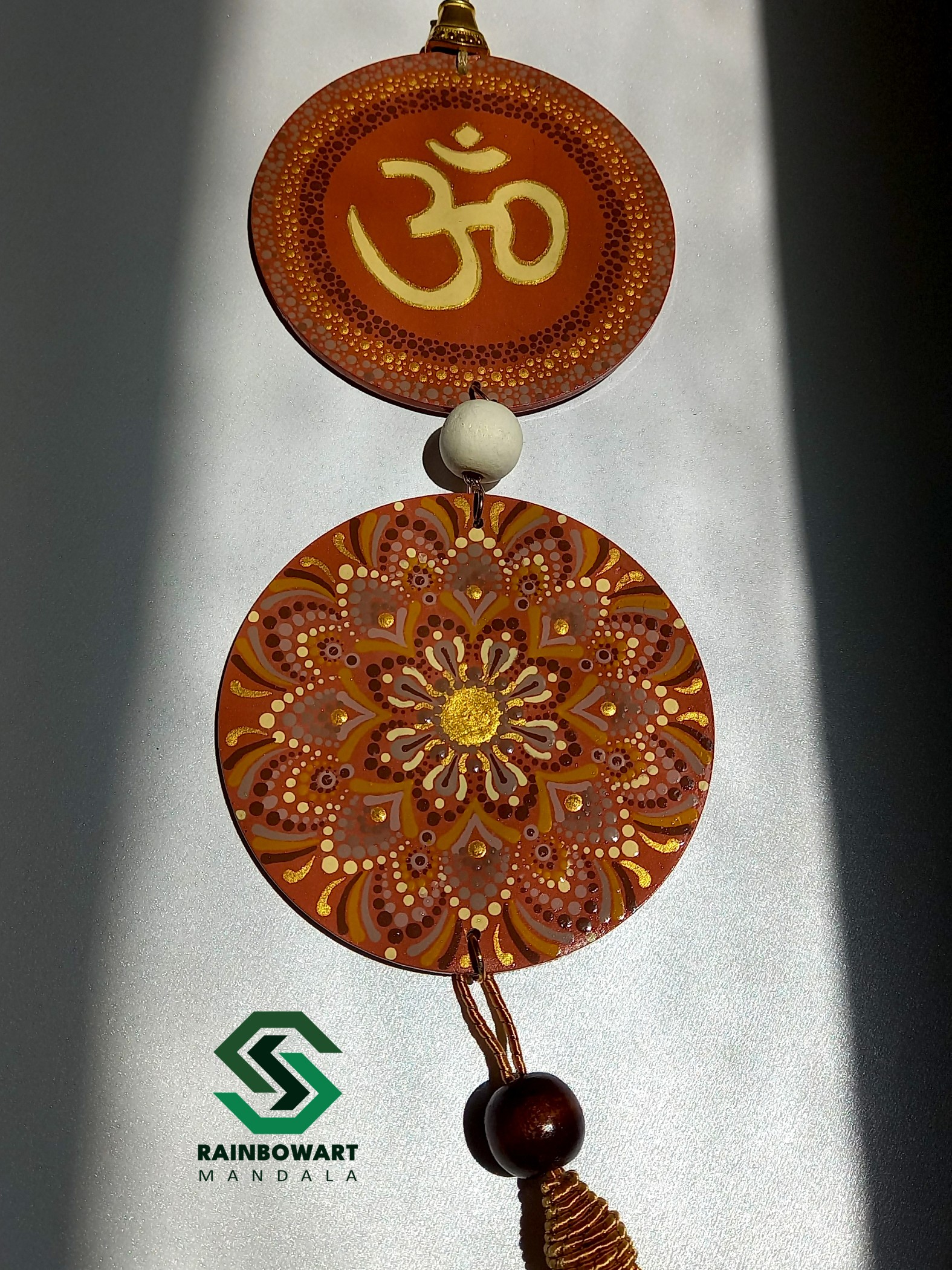 این آویز دیواری دوتکهی دستساز، با نقوش ماندالا و نماد مقدس "ॐ" در بخش بالایی، بیش از یک تکه دکوراتیو ساده است؛ بلکه دعوتی روحانی برای تجربهی آرامش داخلی و اتصال به هستی است.