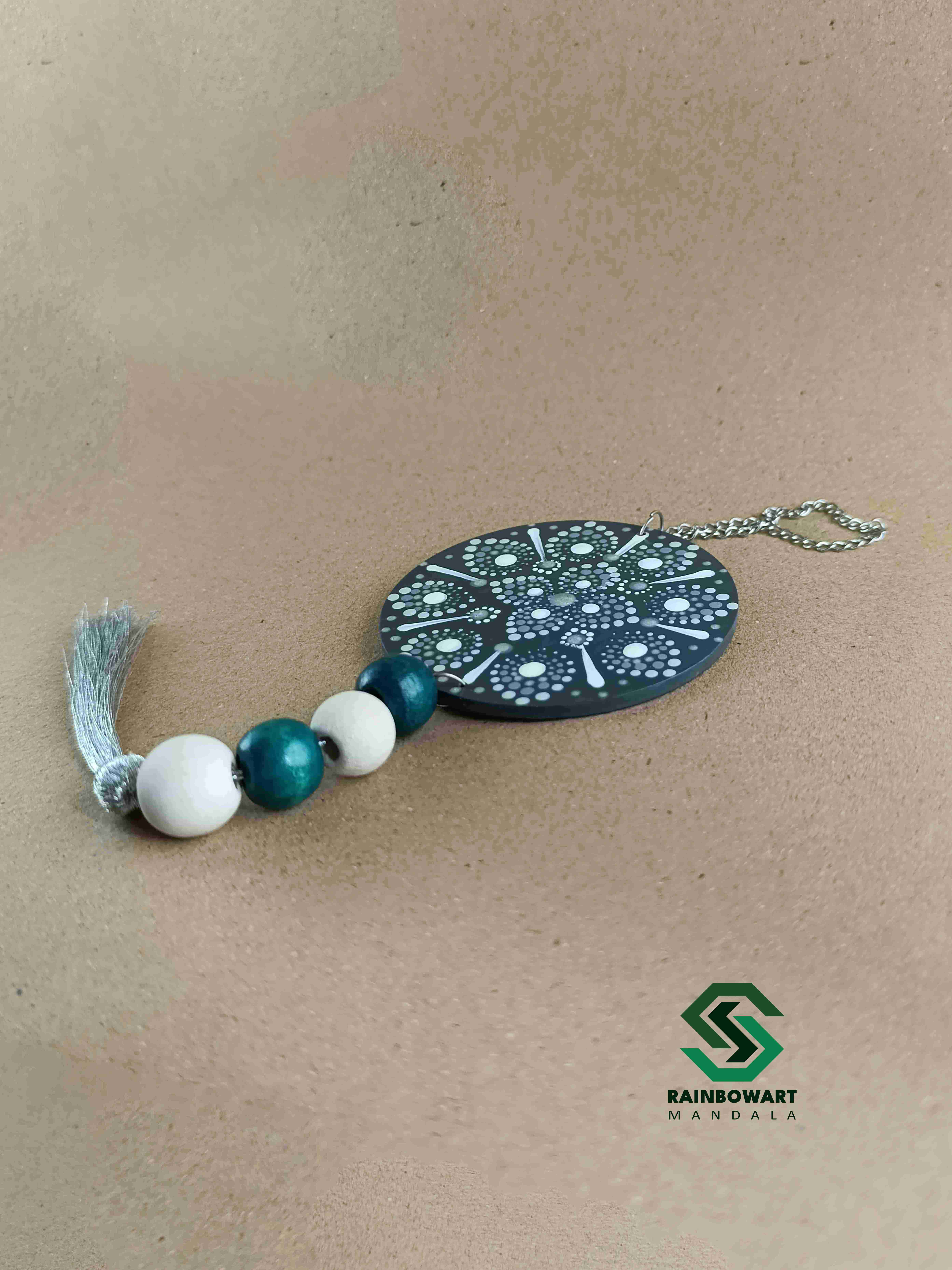 این آویز چوبی دایرهای طوسی، مخصوص نصب روی آینه داخلی ماشین طراحی شده است. رنگ پایه این آویز طوسی است که با طیف رنگهای متنوع طوسی و سفید روی آن کار شده و جلوهای زیبا و متفاوت به فضای داخلی خودرو میبخشد.