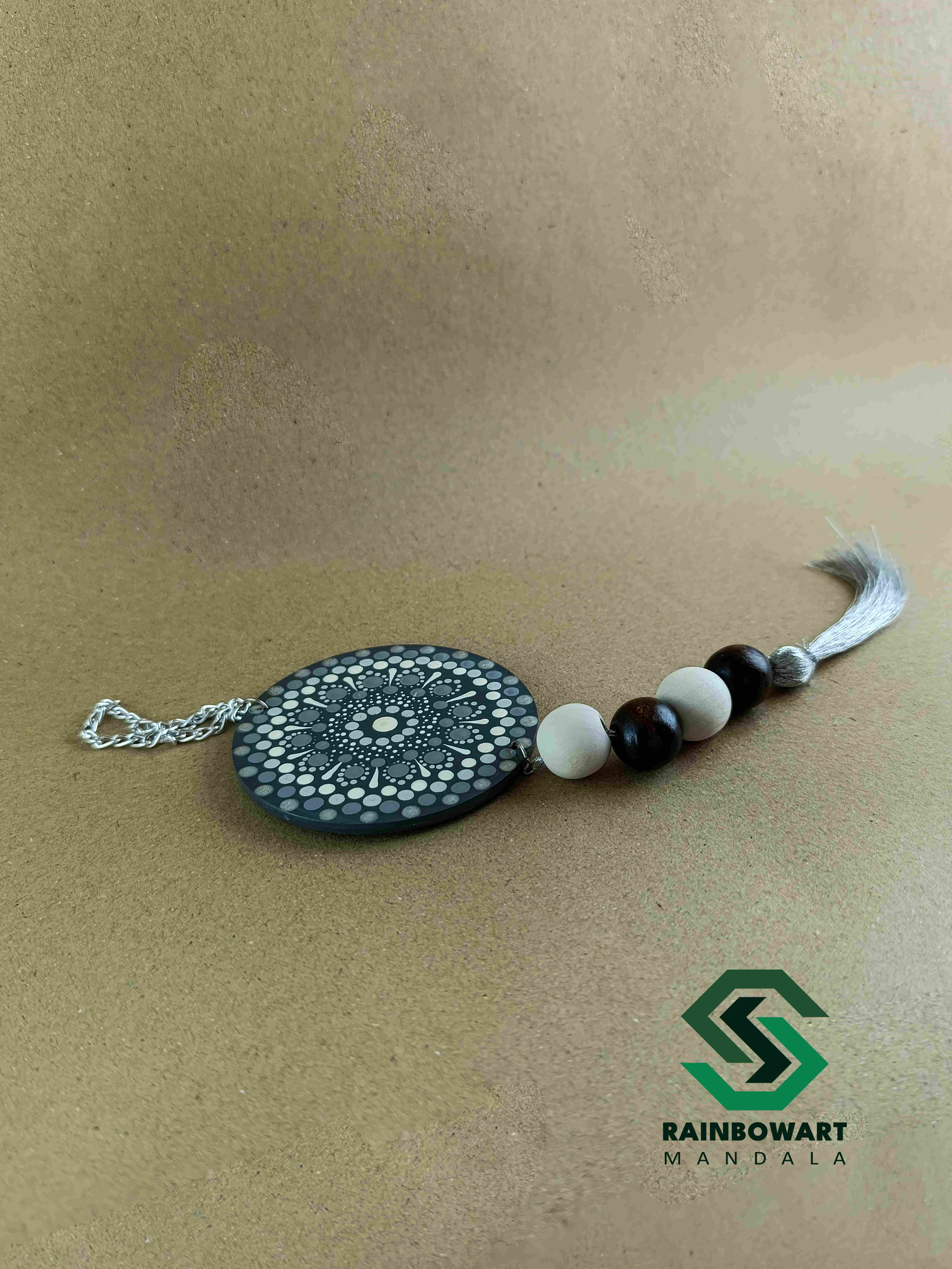 این آویز چوبی دایرهای طوسی، مخصوص نصب روی آینه داخلی ماشین طراحی شده است. رنگ پایه این آویز طوسی است که با طیف رنگهای متنوع طوسی و سفید روی آن کار شده و جلوهای زیبا و متفاوت به فضای داخلی خودرو میبخشد.