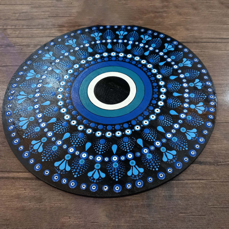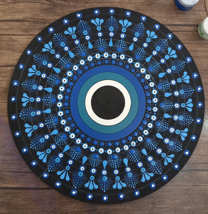 این تابلودیواری دستساز با طرح چشمنظر، بر پایهای چوبی و رنگ غالب آبی طراحی شده است. طیفهای ملایم آبی و سفید در کنار هم، نمادی از آرامش، انرژی مثبت و محافظت را تداعی میکنند.