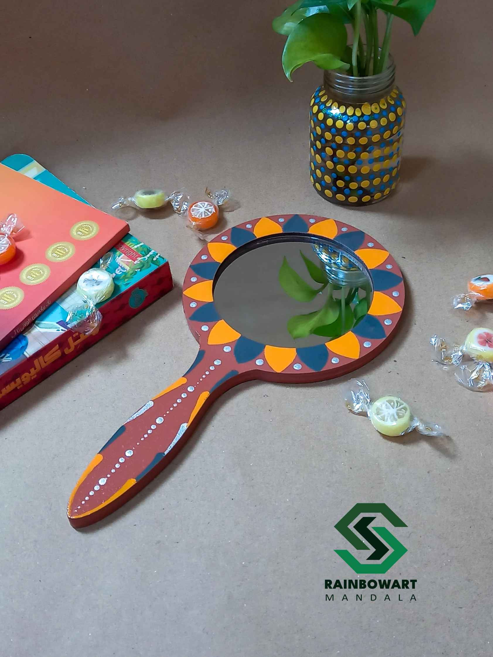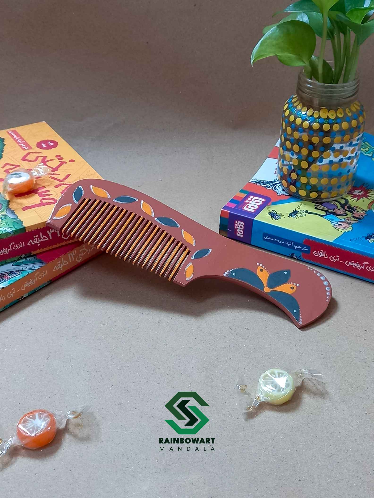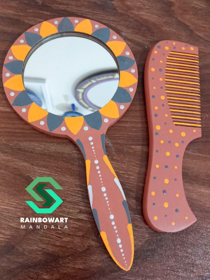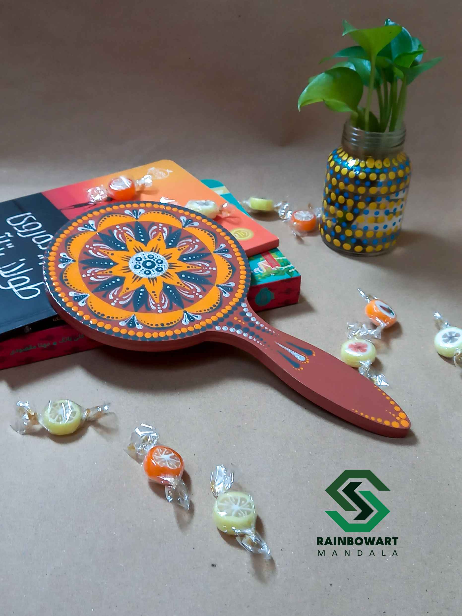 شانه دستی و آئینه دستی چوبی نارنجی قهوه ای | طرح ماندالا و دات ماندالا