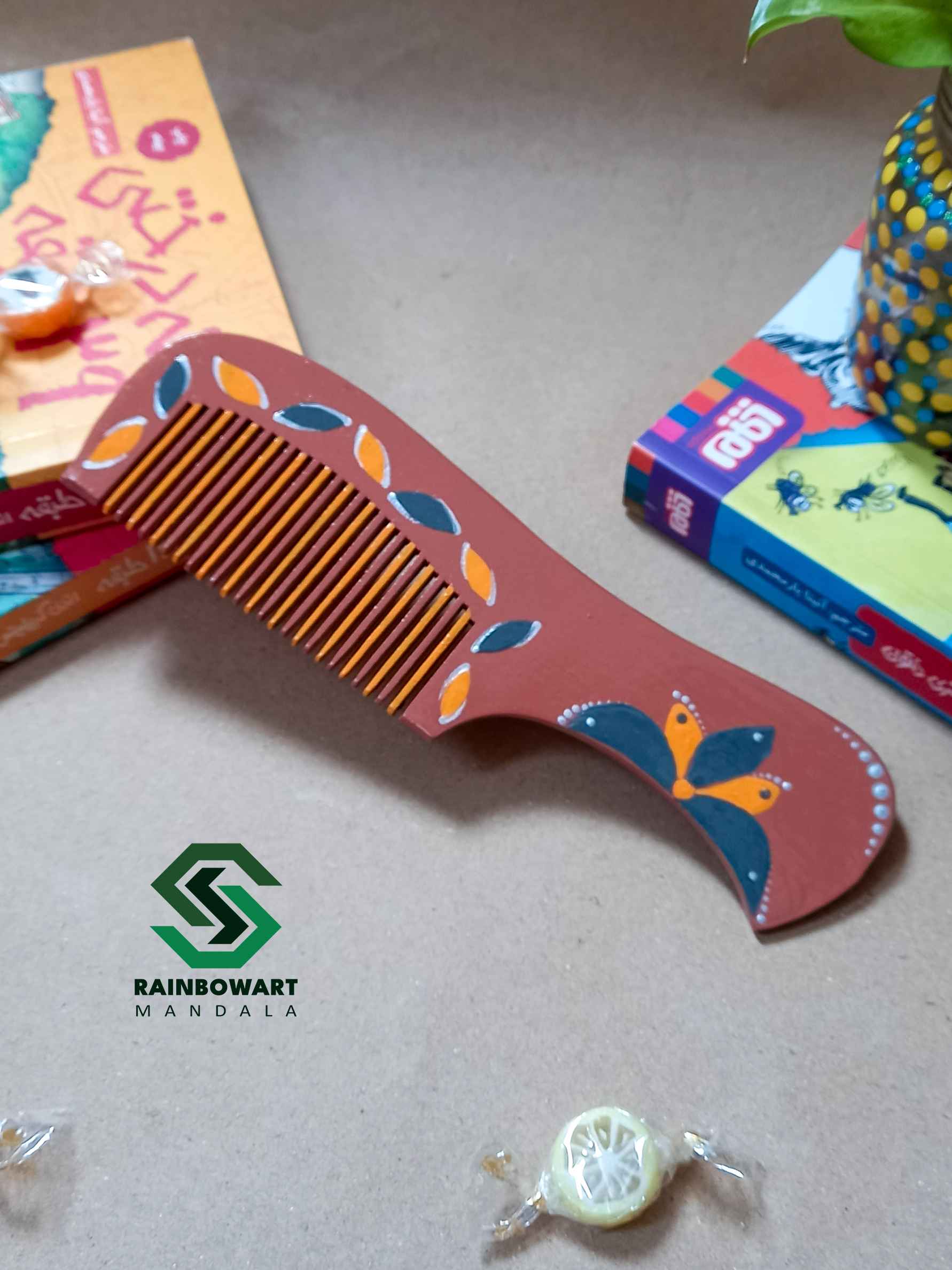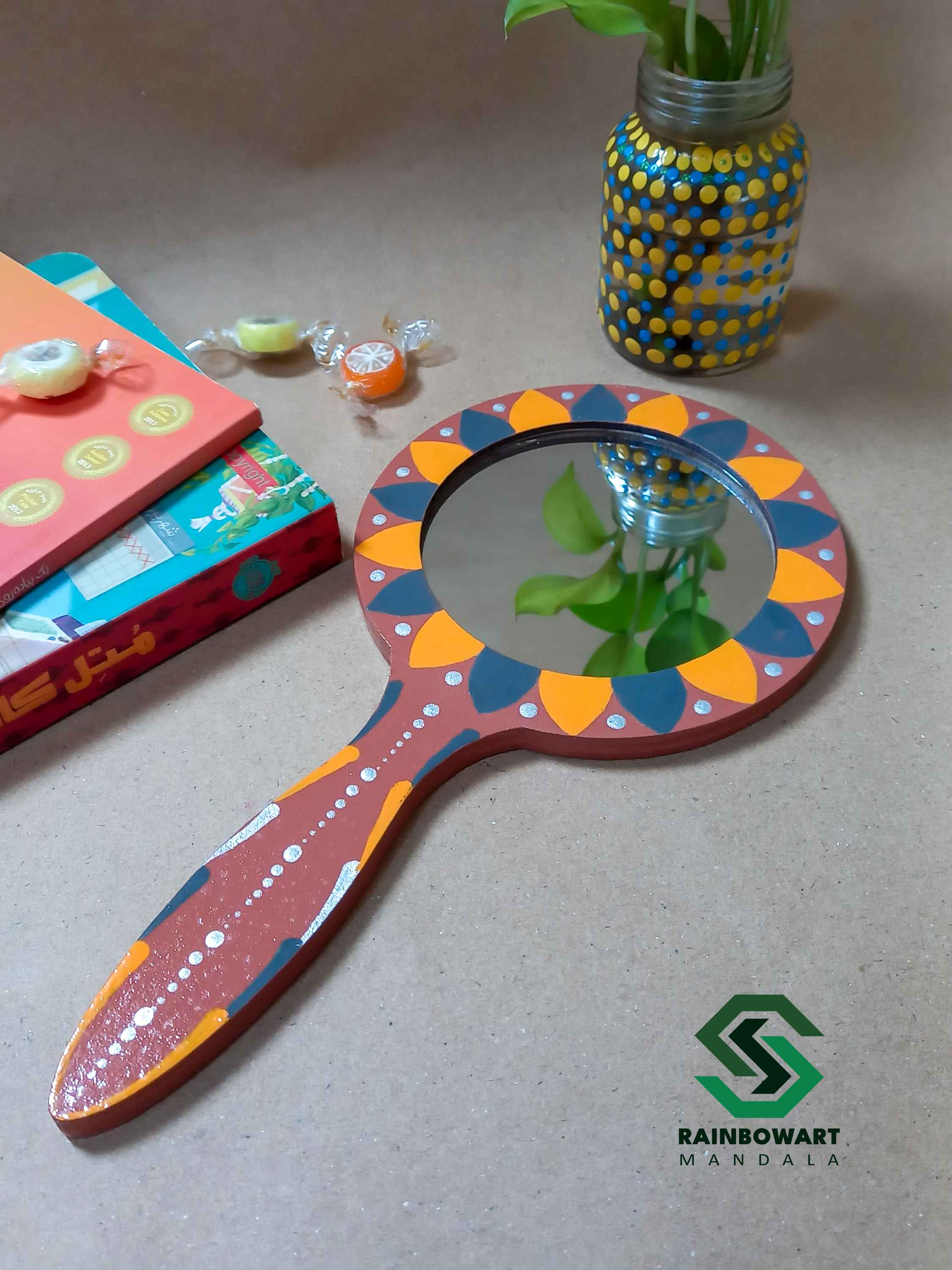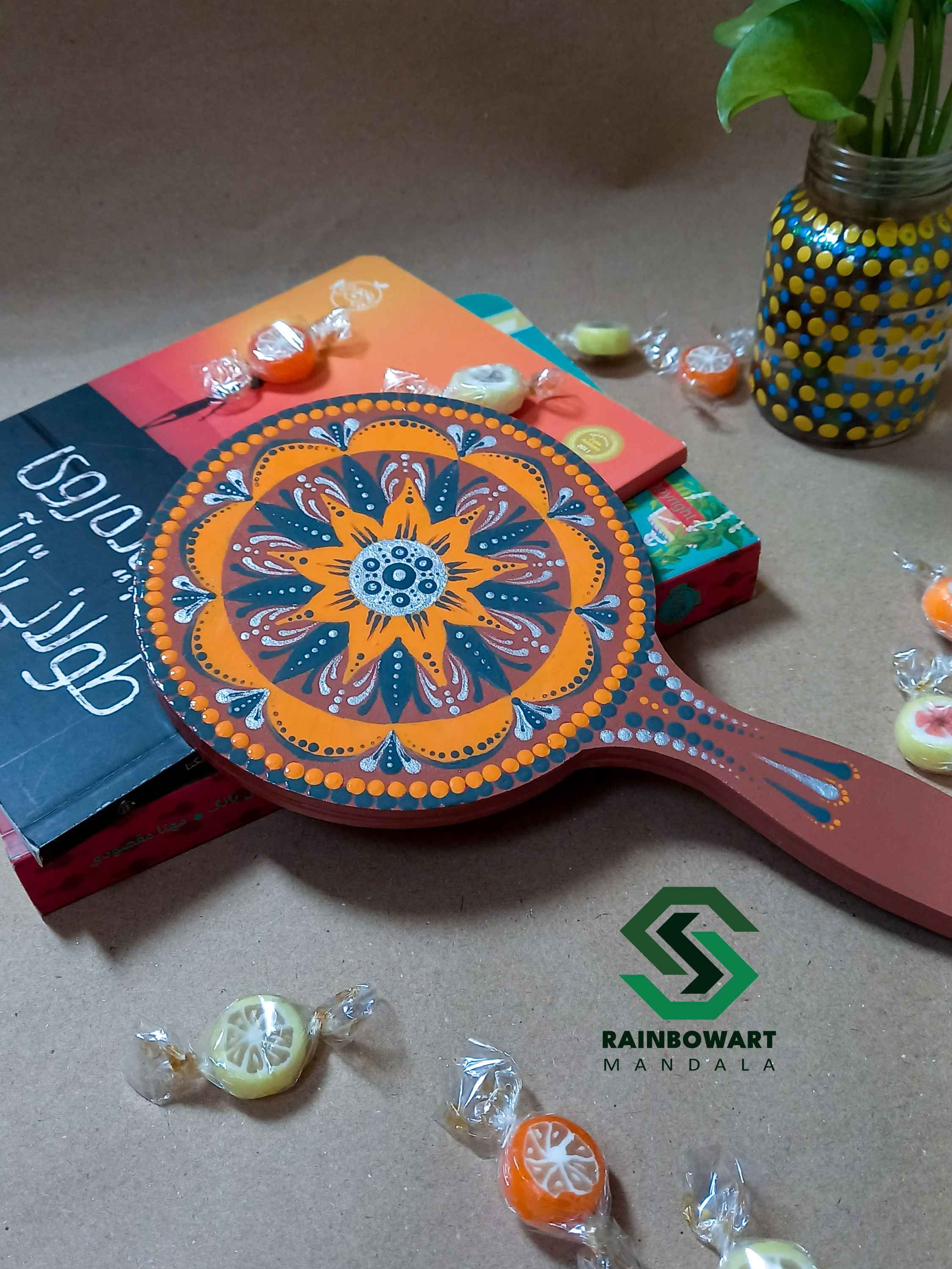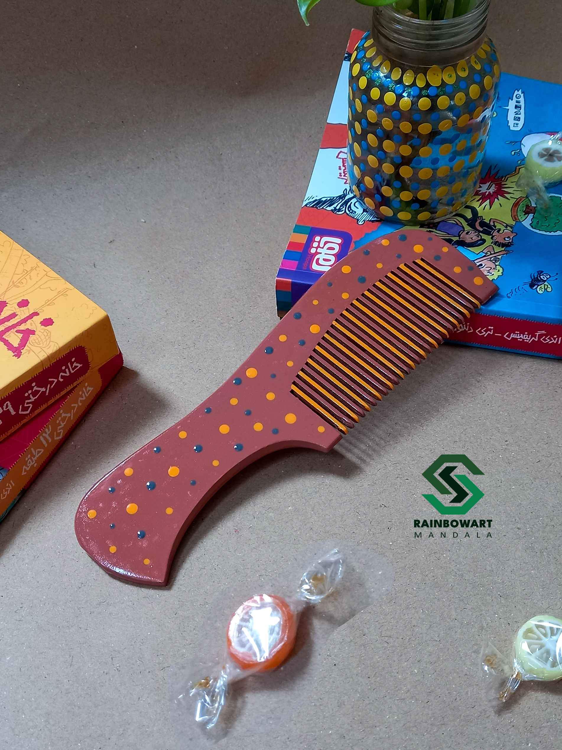 شانه دستی و آئینه دستی چوبی نارنجی قهوه ای | طرح ماندالا و دات ماندالا