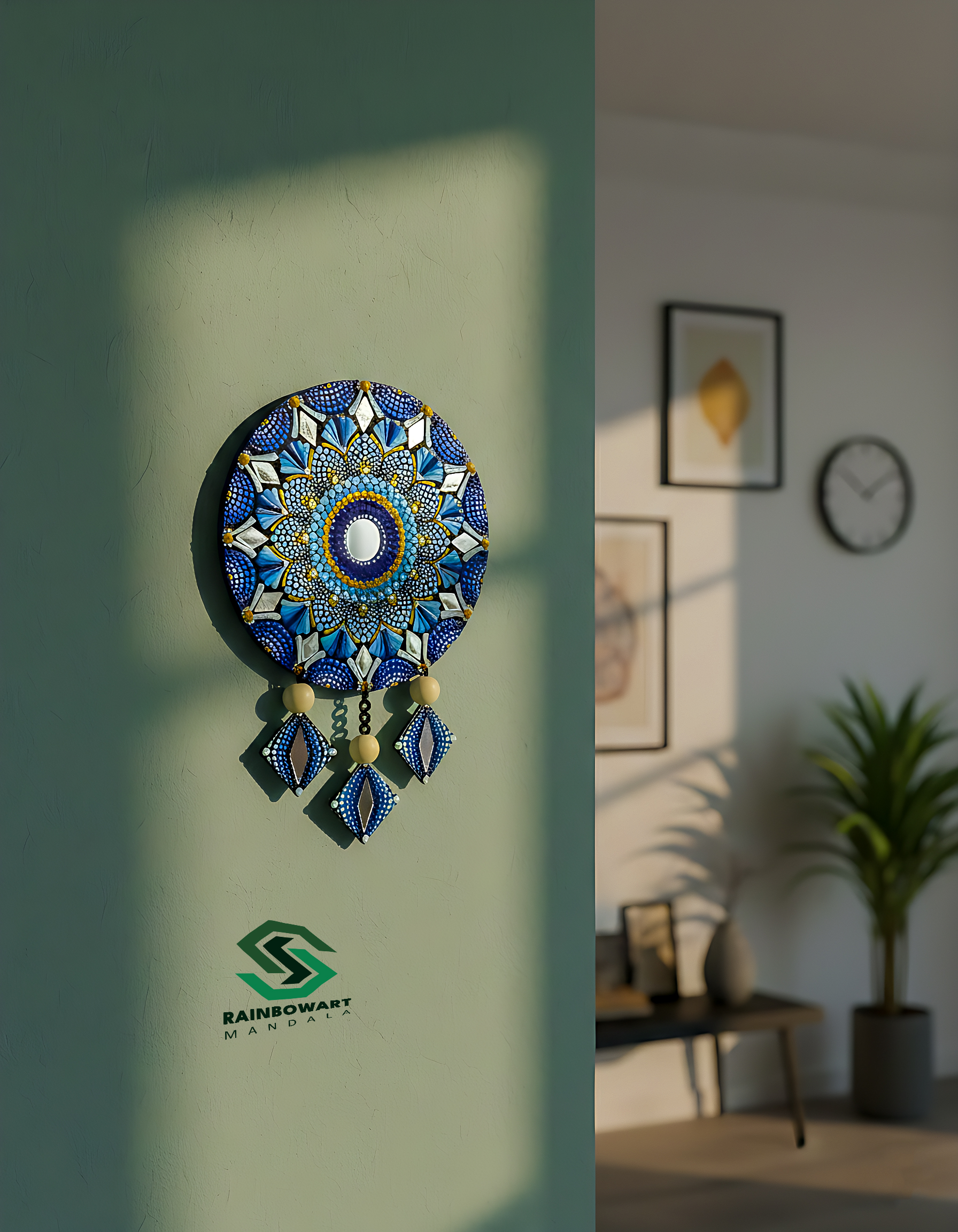 این آویزدیواریِ آبی و آئینه کاری شده, با طیفهای رنگی آبی و تکّههای آینه کار شده, و پایین کار, 3 آویز مربعی از آن آویخته شده.