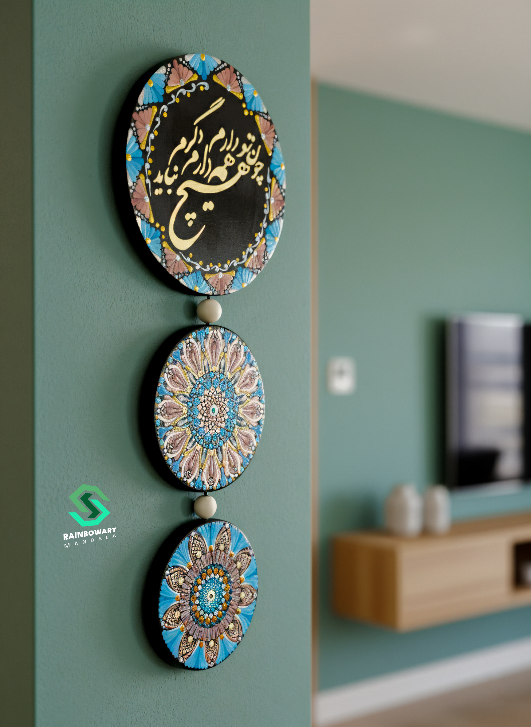 این آویزدیواریَ سه تکه با طیف رنگی آبی آسمانی و کرمیِ چشمنوازی کار شده. در دایرۀ بالا نیز, بیت زیبای "چون تو دارم همه دارم, دگرم هیج نباید" با ظرافت و دقّت هنرمند این مجموعه, سهیلا میرزایی, طراحی شده.