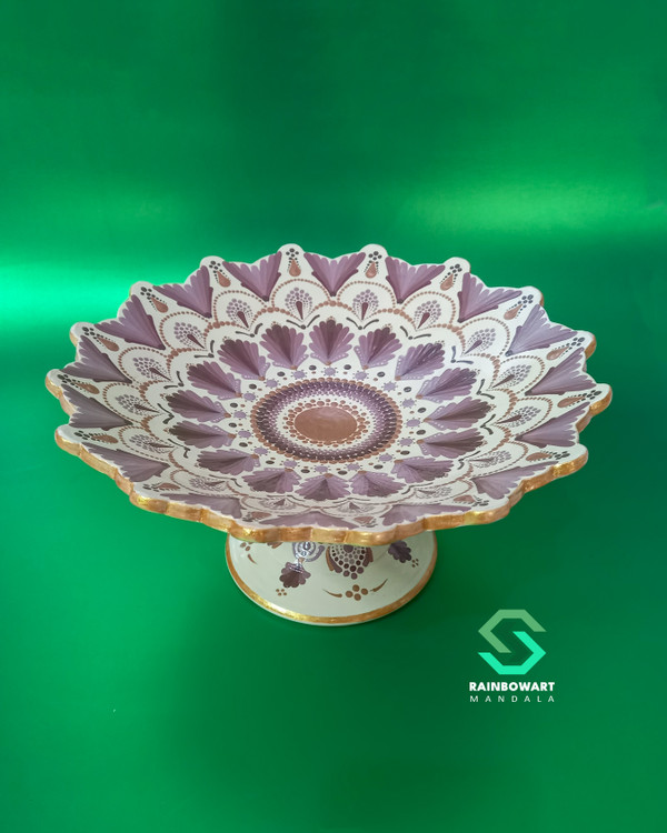 جنس این شیرینیخوریِ پایهدار, سفالی هست و با ظرافت خاصی توسط سهیلا میرزایی, نقوش ماندالا و دات ماندالا با ترکیب رنگی گرم و صمیمی روی آن نقاشی شده.