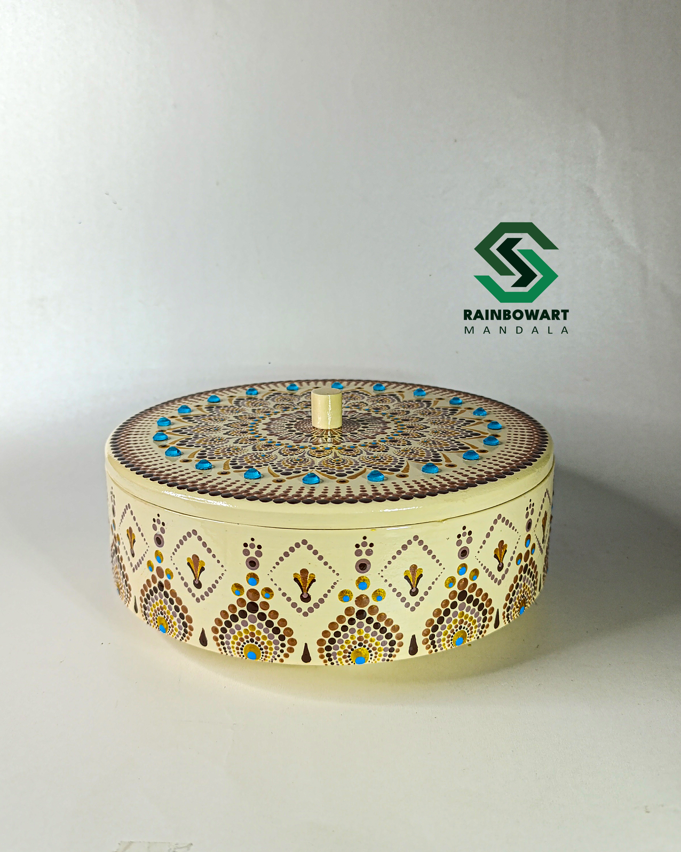 Cream Wooden Nut Bowl with blue gem | Mandala and Dot Mandala Design