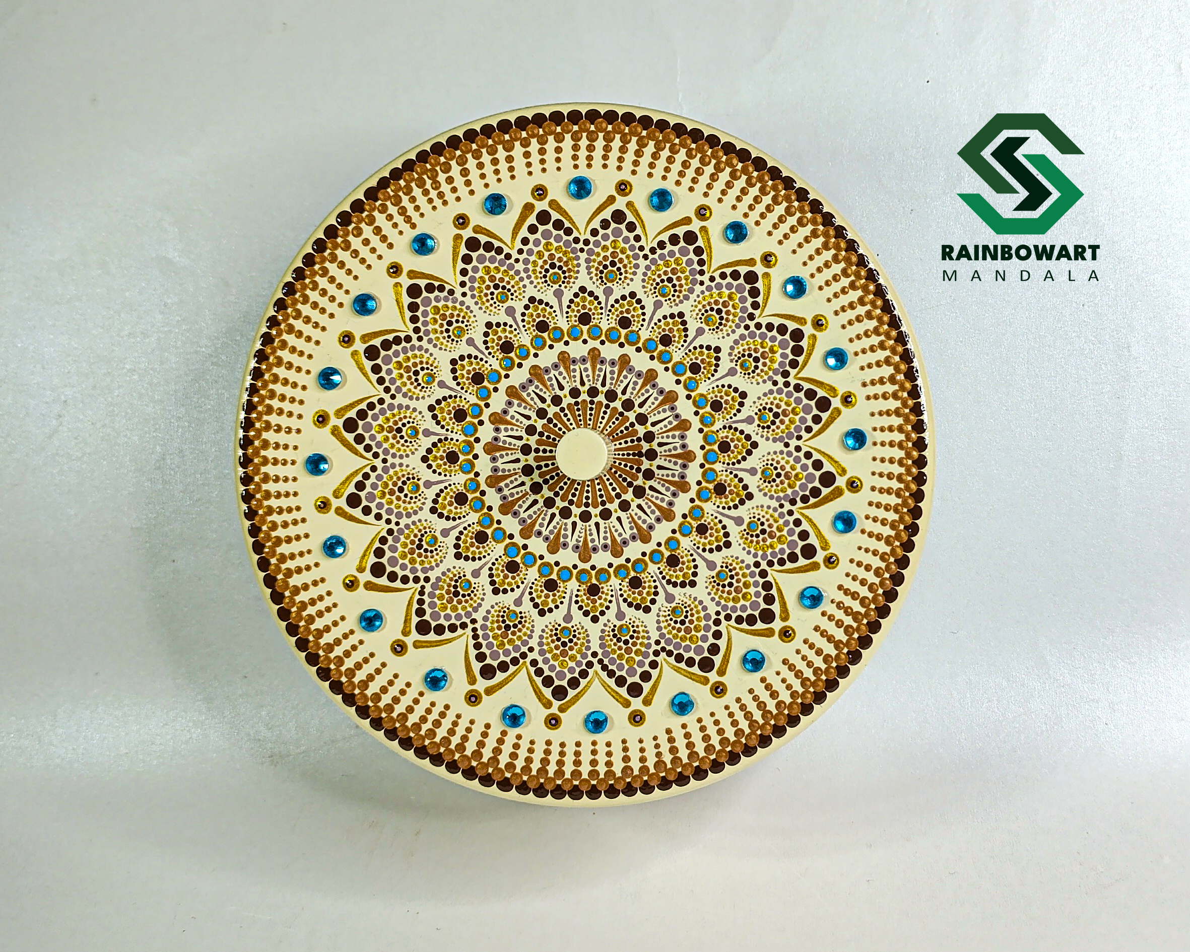 خرید هدیه هنری با قیمت مناسب | هدیه دستساز ماندالا و دات ماندالا | خرید هدیه از فروشگاه رینبوآرت | آجیل خوری ماندالا و دات ماندالا چوبی کرمی