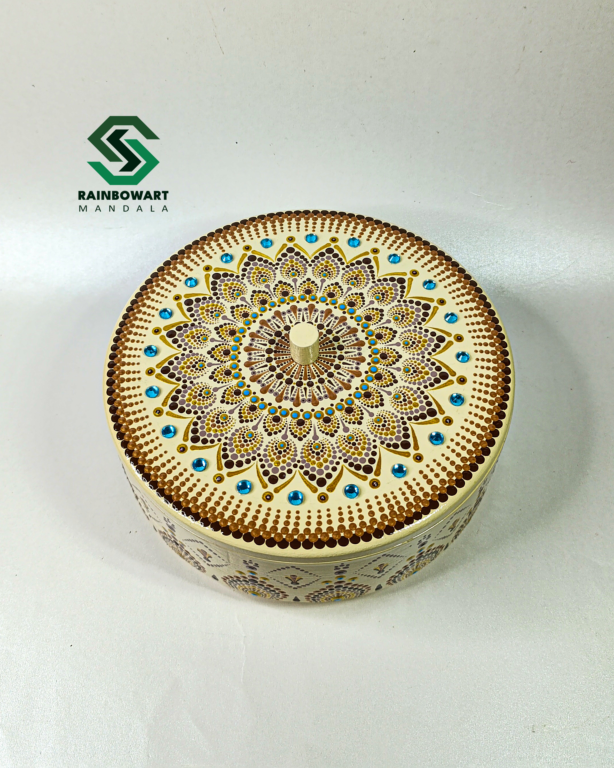 خرید آجیل خوری کرمی با نقوش ماندالا و دات ماندالا از فروشگاه رینبوآرت | سفارش آجیل خوری چوبی با رنگ و طرح دلخواه