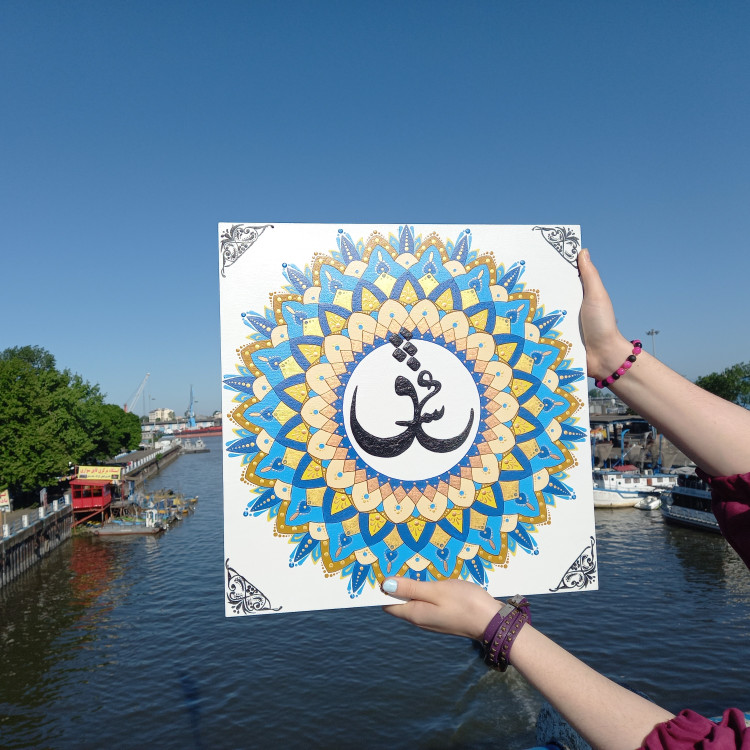این تابلو دیواری چهارگوش چوبی، با زمینهای سفید و تزئیناتی در طیفهای آرامبخش آبی و درخشان طلایی، جلوهای خاص و مینیمال به خود گرفته است. در مرکز تابلو، واژهی زیبای "عشق" با خط نستعلیق کار شده که نه تنها هویتی هنری به آن بخشیده، بلکه حس عاطفه، معنا و ارتباط را به فضا منتقل میکند.