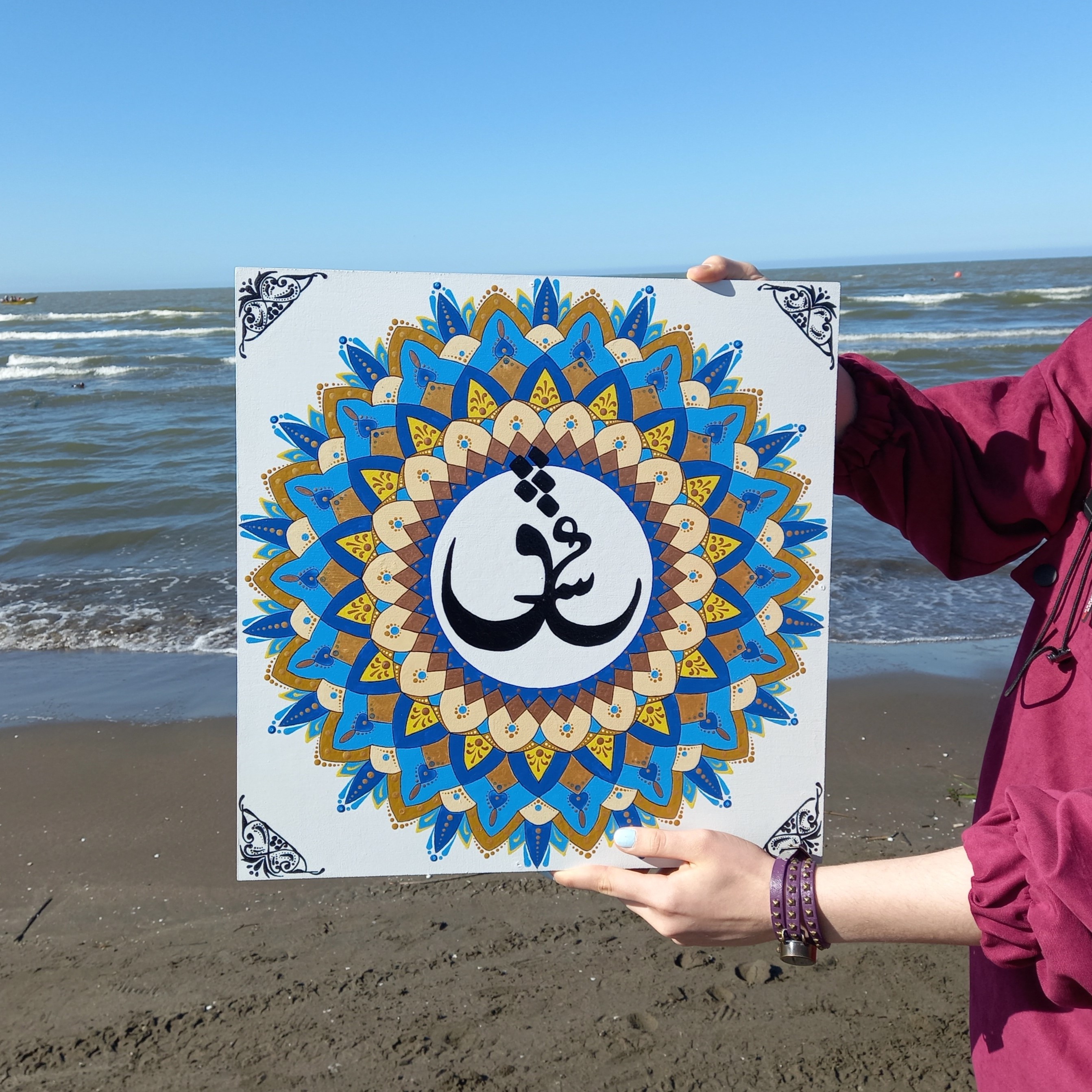 این تابلو دیواری چهارگوش چوبی، با زمینهای سفید و تزئیناتی در طیفهای آرامبخش آبی و درخشان طلایی، جلوهای خاص و مینیمال به خود گرفته است. در مرکز تابلو، واژهی زیبای "عشق" با خط نستعلیق کار شده که نه تنها هویتی هنری به آن بخشیده، بلکه حس عاطفه، معنا و ارتباط را به فضا منتقل میکند.