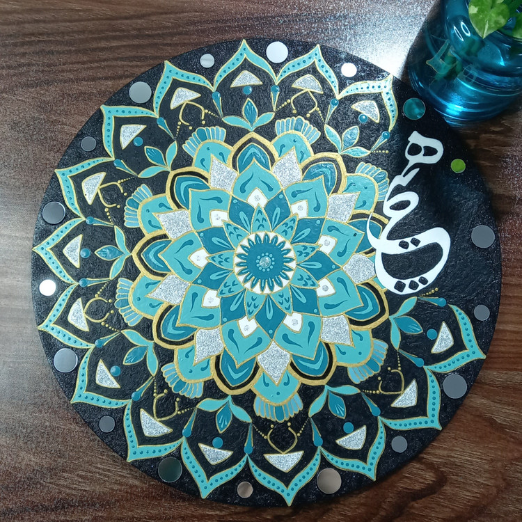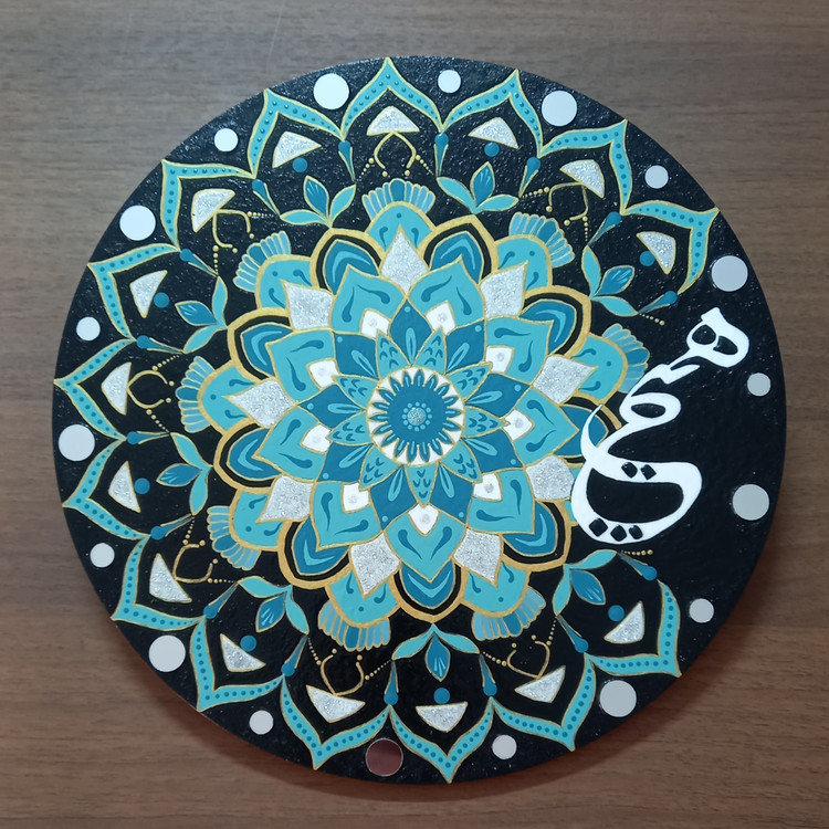 تابلو دیواری دایرهای چوبی با زمینهی مشکی و داتماندالاهایی درخشان به رنگهای فیروزهای و نقرهای، اثری است چشمنواز و در عین حال عمیق. در مرکز تابلو، واژهی پرمعنای "هیچ" با الهام از شعر معروف مولانا "دنیا همه هیچ و اهل دنیا همه هیچ" با ظرافت خاصی حک شده، تا عمق معنا و فلسفهی زندگی را در دل یک اثر هنری بازتاب دهد.