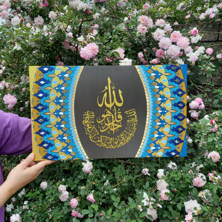 در مرکز تابلو، واژهی مبارک "قل هو الله" با خط نستعلیق زیبا و رنگ طلایی کار شده است. این بخش از سوره اخلاص، افزون بر زیبایی بصری، معنایی معنوی و آرامبخش به اثر بخشیده و آن را به انتخابی ایدهآل برای فضاهای روحانی، خانههای اهل دل، یا حتی هدیهای ارزشمند برای مناسبتهای خاص تبدیل کرده است.