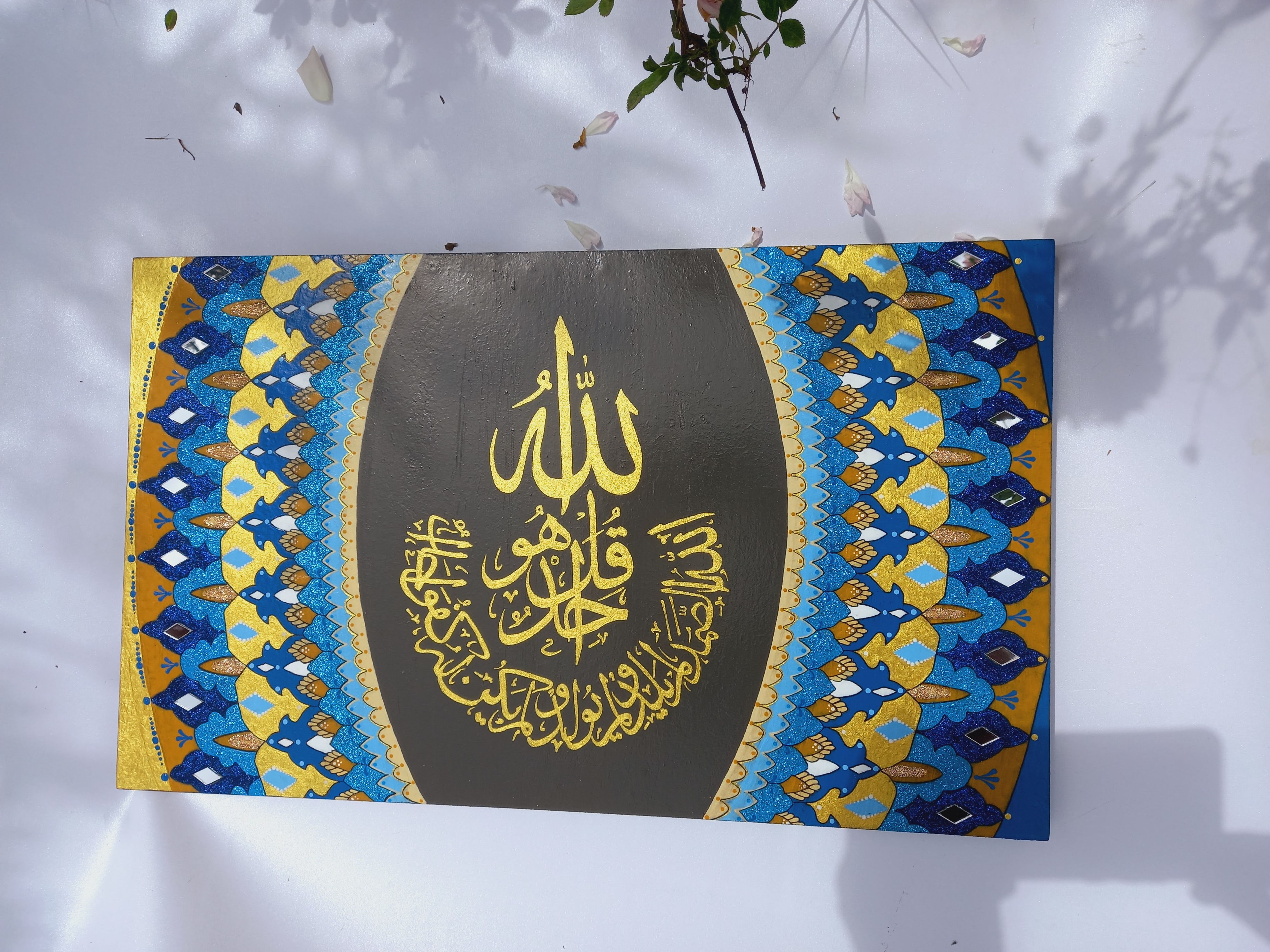 تابلودیواری چوبی مستطیلی با خوشنویسی قرآنی "قل هوالله.." | طرح ماندالا و دات ماندالا
