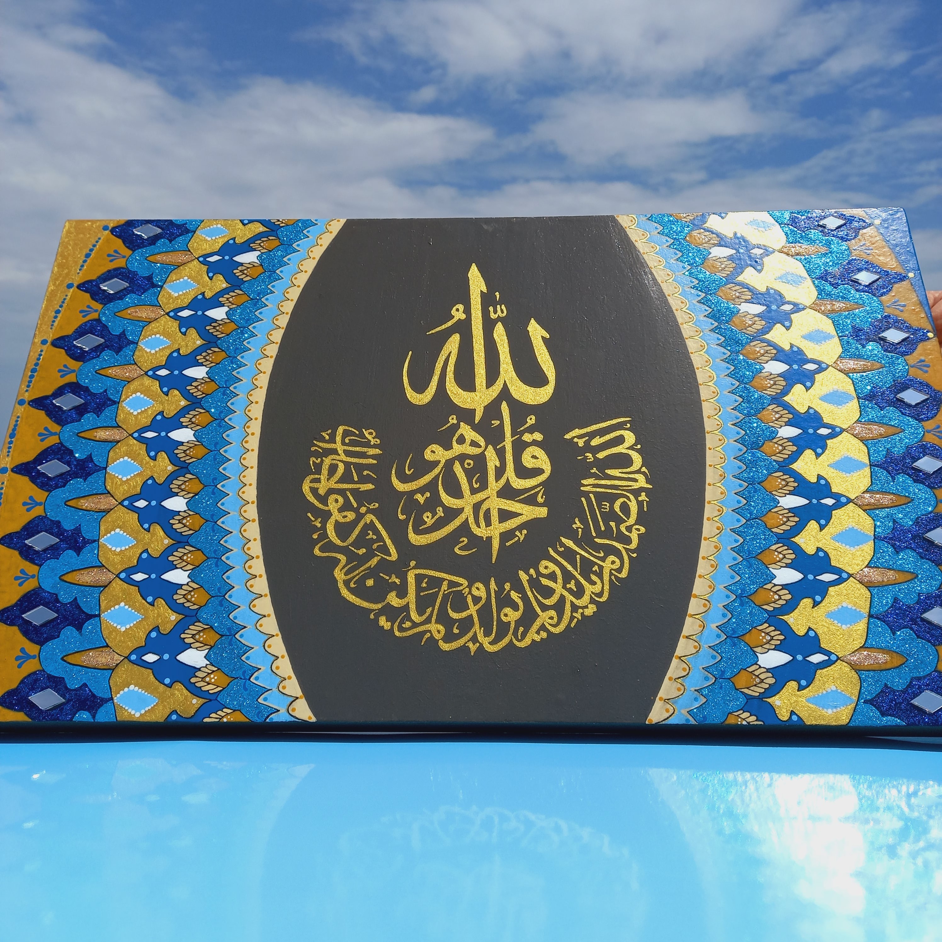 در مرکز تابلو، واژهی مبارک "قل هو الله" با خط نستعلیق زیبا و رنگ طلایی کار شده است. این بخش از سوره اخلاص، افزون بر زیبایی بصری، معنایی معنوی و آرامبخش به اثر بخشیده و آن را به انتخابی ایدهآل برای فضاهای روحانی، خانههای اهل دل، یا حتی هدیهای ارزشمند برای مناسبتهای خاص تبدیل کرده است.