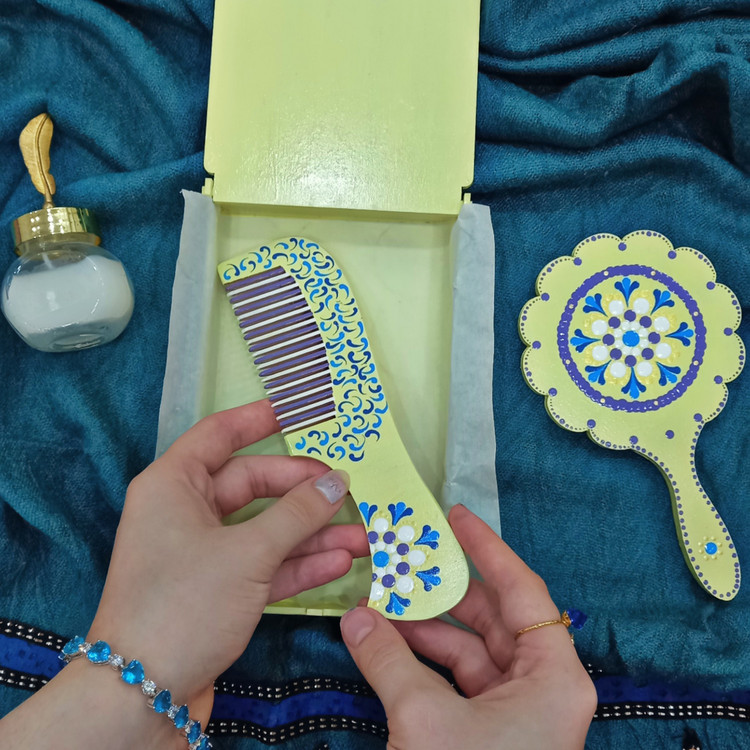 طراحی کاملاً سفارشی این محصول، آن را برای هدیه دادن نیز به گزینهای منحصربهفرد تبدیل کرده است. آینه و شانه دستی هر دو به شکلی خوشدست و سنتی طراحی شدهاند و جعبه مخصوص نگهداریشان، ترکیب کاربردی و زیبایی را کامل میکند.