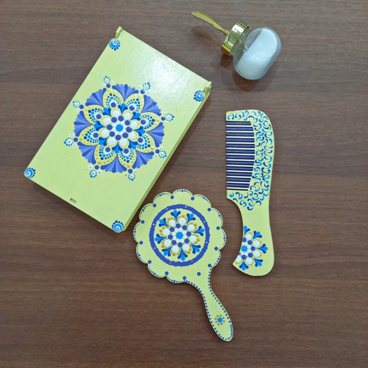شانه دستی به همراه آئینه دستی و جعبه ست زرد | طرح ماندالا و دات ماندالا