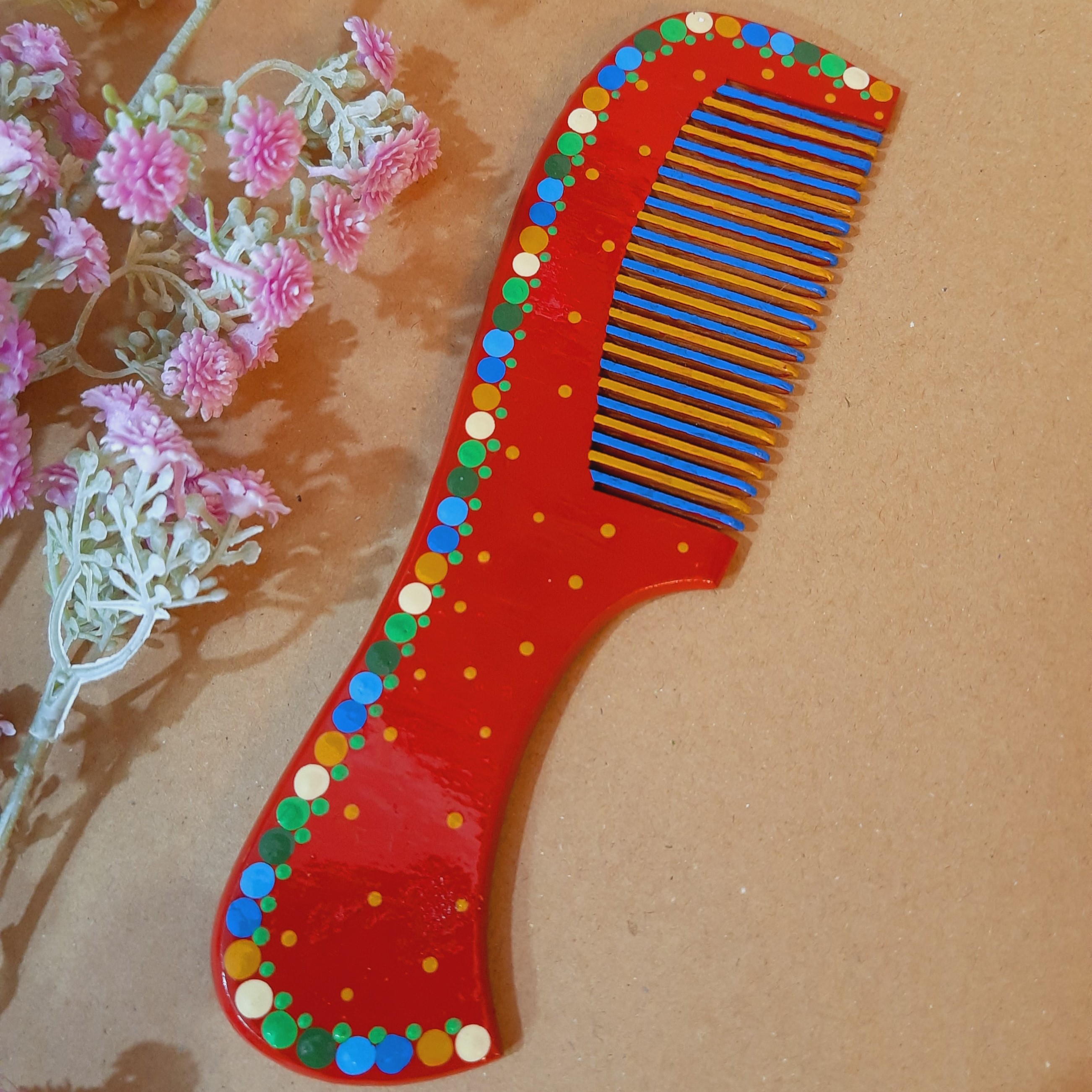 شانه دستی چوبی رنگ قرمز، طراحی کلاسیک و خوشدست، ساخته شده از چوب مرغوب. این شانه برای استفاده روزمره و مراقبت از موها مناسب است و به راحتی در کیف یا جیب جای میگیرد.