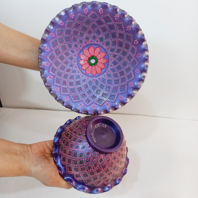 این ست خاص شامل یک کاسه و یک بشقاب سفالی است که با رنگ بنفش جذاب در زمینه و نقطهکوبیهایی ظریف به رنگهای سفید، صورتی و سبز تزئین شده. تمامی نقوش با دست و با تکنیک ماندالا و نقطهکوبی کار شدهاند، که حس هنر سنتی را با لطافت رنگها و فرم مدرن تلفیق میکنند.