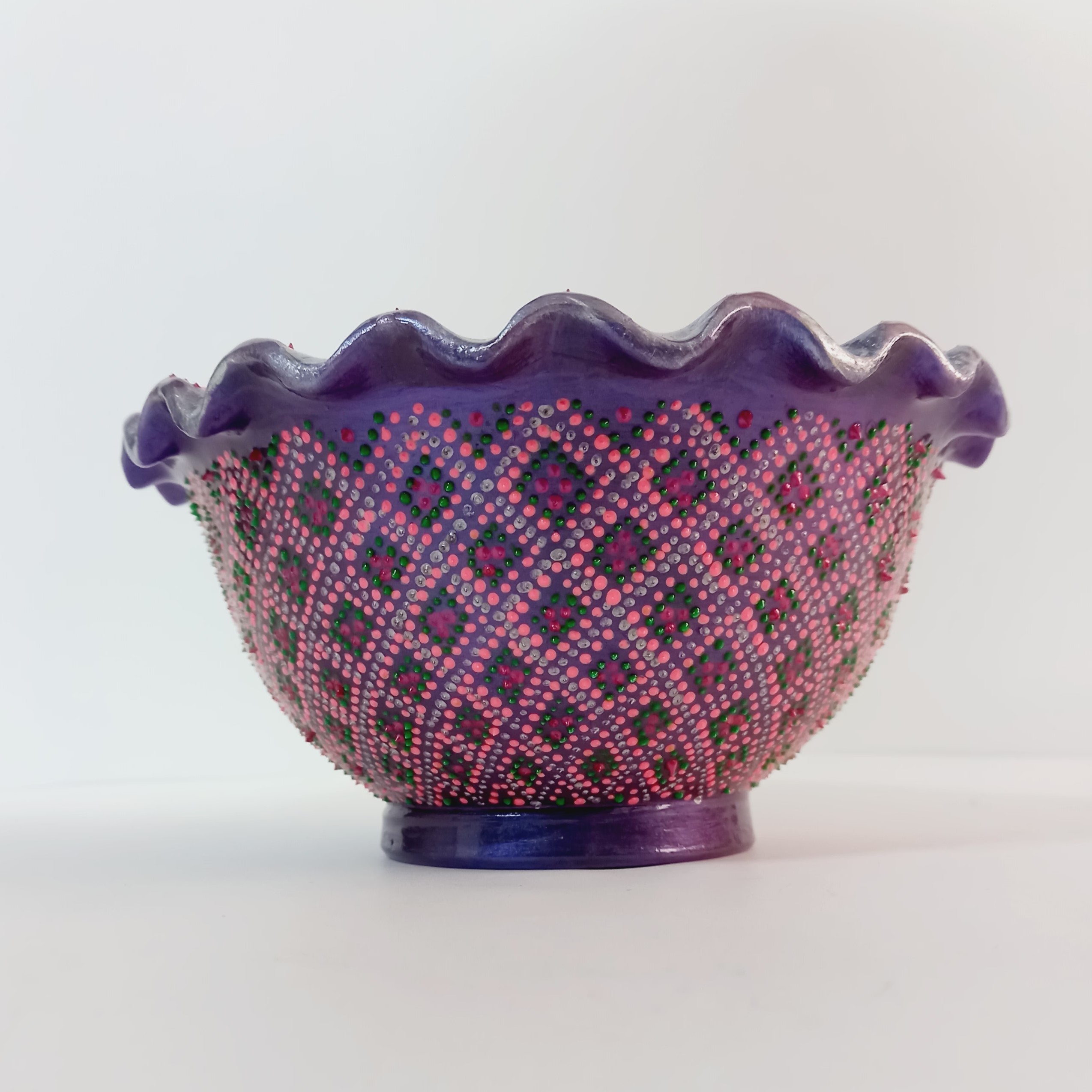 این ست خاص شامل یک کاسه و یک بشقاب سفالی است که با رنگ بنفش جذاب در زمینه و نقطهکوبیهایی ظریف به رنگهای سفید، صورتی و سبز تزئین شده. تمامی نقوش با دست و با تکنیک ماندالا و نقطهکوبی کار شدهاند، که حس هنر سنتی را با لطافت رنگها و فرم مدرن تلفیق میکنند.