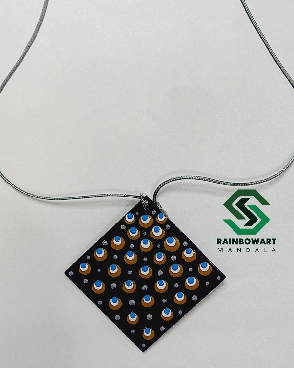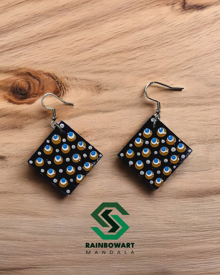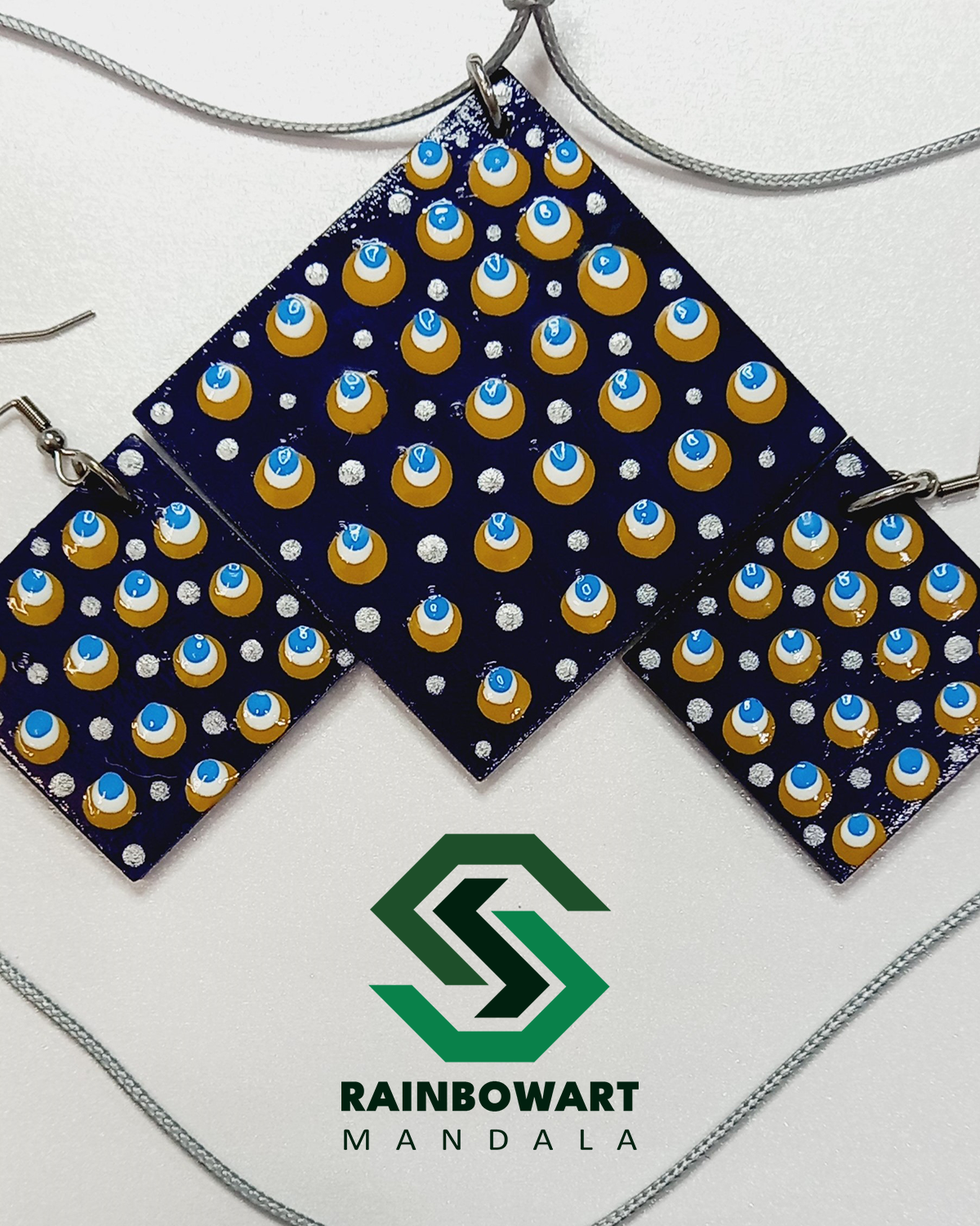 این ست گوشواره و گردنبند چوبی مربعی با زمینه سورمهای، آراسته به نقوش هنری ماندالا و دات ماندالا، انتخابی زیبا و شیک برای تکمیل استایل روزانه یا مهمانیهای شما است.
