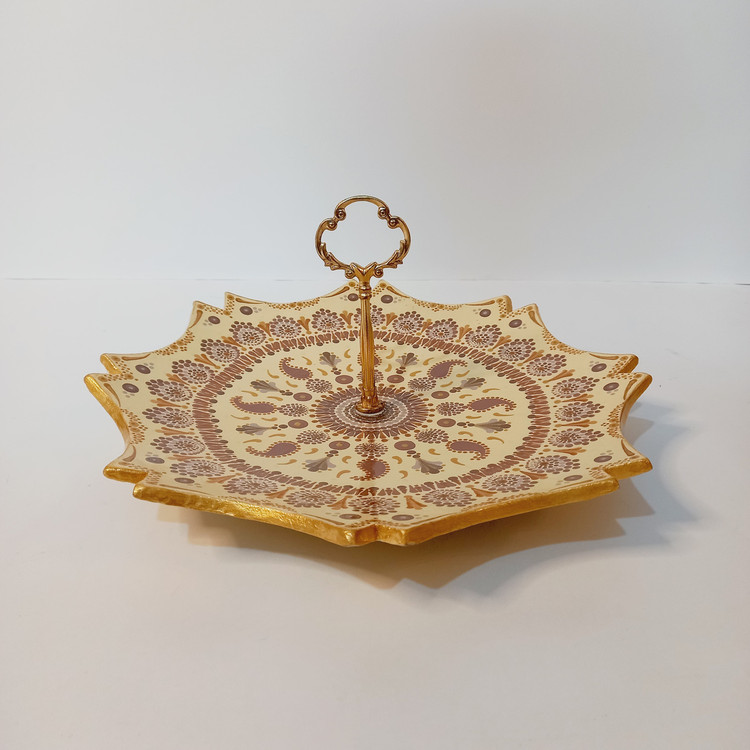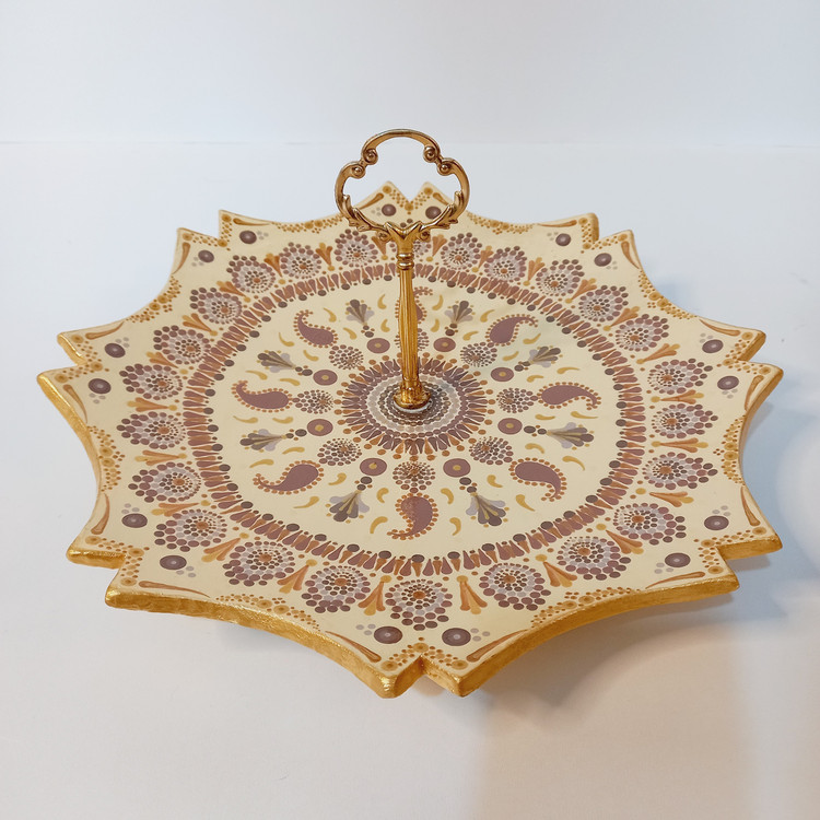 این بشقاب سفالی خاص با رنگ کرمی ملایم و طراحی طیفهای قهوهای روشن، ترکیبی چشمنواز از هنر سنتی و سبک مدرن رو به نمایش میگذاره. دستهی فلزی طلایی در مرکز آن نهتنها جلوهی لوکسی به بشقاب میده، بلکه حمل و جابجایی اون رو هم راحتتر میکنه.
