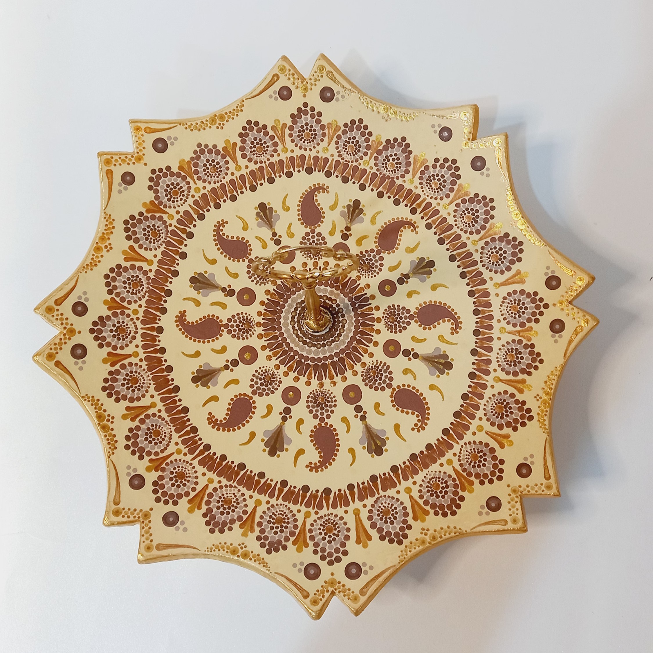 این بشقاب سفالی خاص با رنگ کرمی ملایم و طراحی طیفهای قهوهای روشن، ترکیبی چشمنواز از هنر سنتی و سبک مدرن رو به نمایش میگذاره. دستهی فلزی طلایی در مرکز آن نهتنها جلوهی لوکسی به بشقاب میده، بلکه حمل و جابجایی اون رو هم راحتتر میکنه.