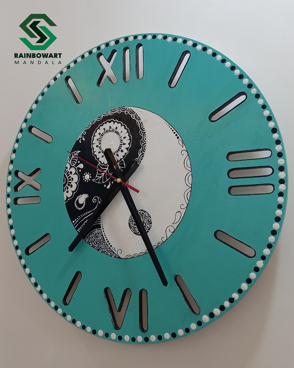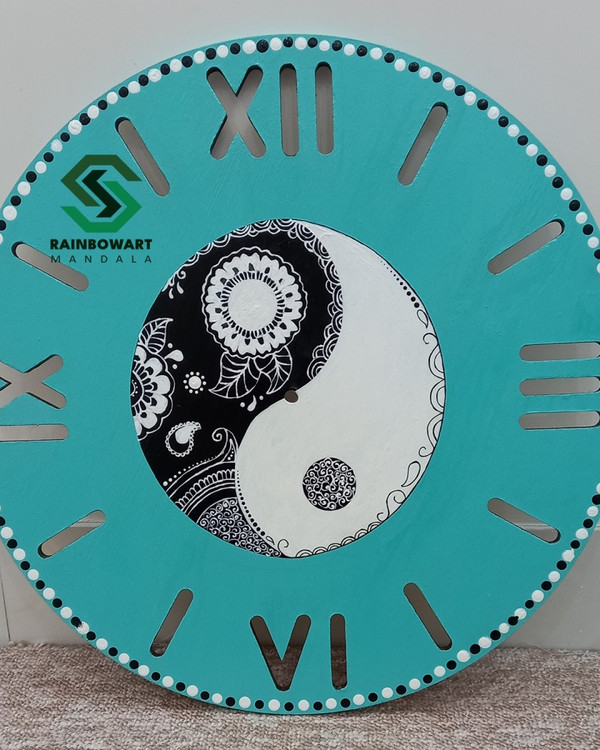 ساعت دیواری چوبی یین و یانگ با پس زمینه فیروزه ای | طرح ماندالا و دات ماندالا