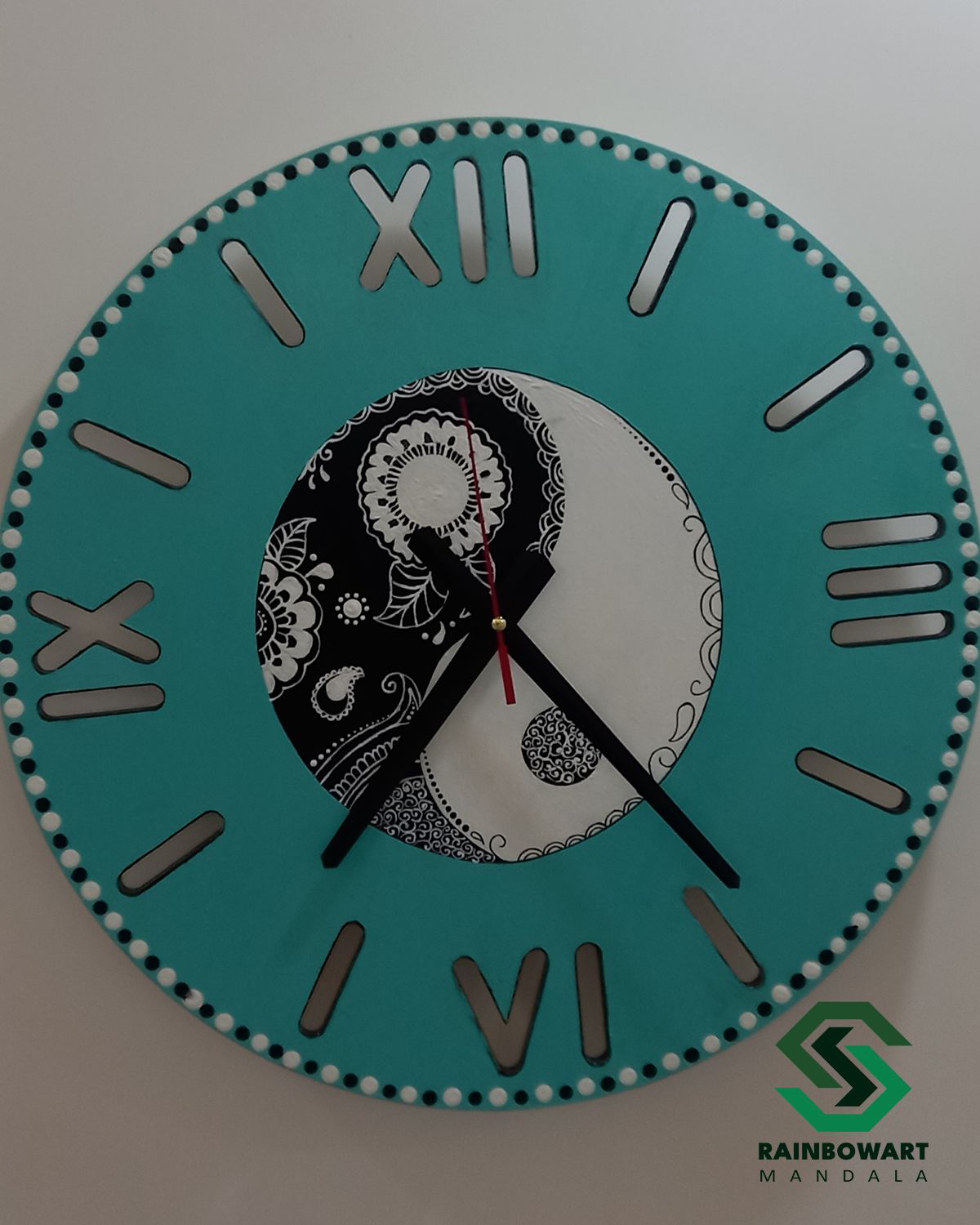 ساعت دیواری چوبی یین و یانگ با پس زمینه فیروزه ای | طرح ماندالا و دات ماندالا