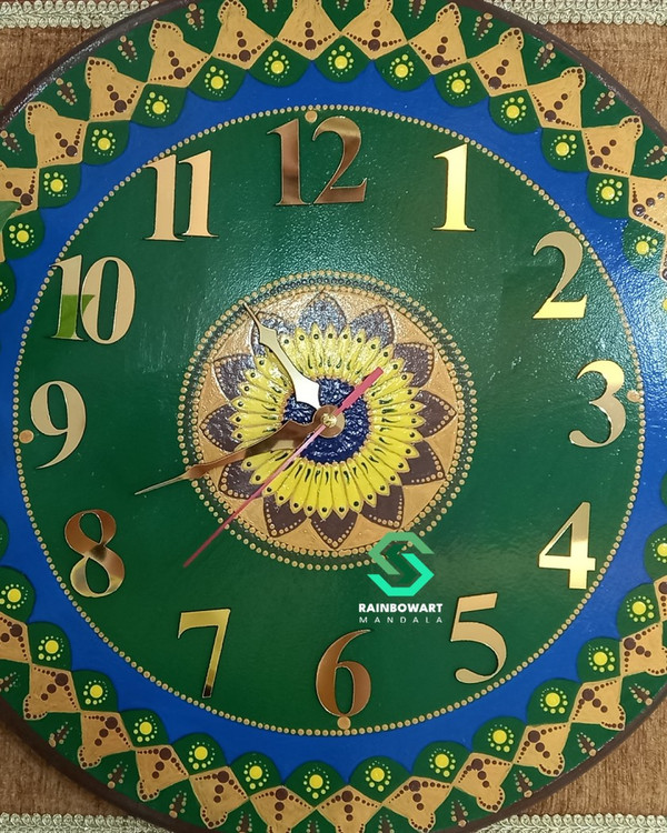 این ساعت دیواری چوبی، یک اثر سفارشی و کاملاً دستساز است که با دقت و سلیقه برای منزل طراحی و اجرا شده. بدنهی دایرهای با رنگ سبز تیره و نقوش ظریف ماندالا به رنگهای طلایی، آبی و سبز تزئین شده تا حس هماهنگی، آرامش و شکوه را به فضا القا کند.