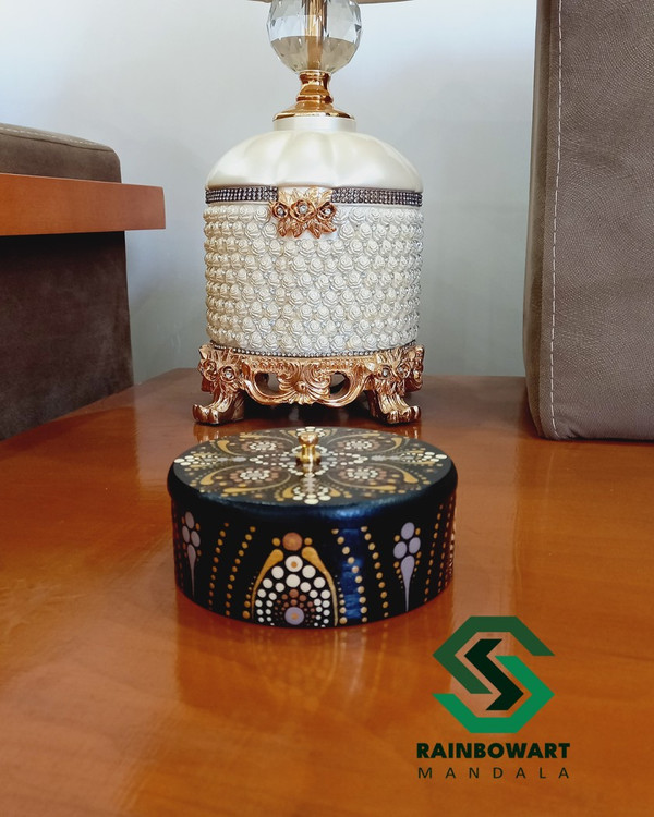 این قندان چوبی دستساز با بدنه مشکی مات، طراحی شده به سبک مدرن و ساده، با نقوش دات ماندالا به رنگهای طلایی و کرمی که روی بدنه و درب آن هماهنگ کار شده است. طراحی لوکس و چشمنواز این قندان باعث شده بهعنوان یک قطعه دکوری شیک و کاربردی برای انواع فضاها، از میز پذیرایی گرفته تا محل کار و دکور خانه، استفاده شود.