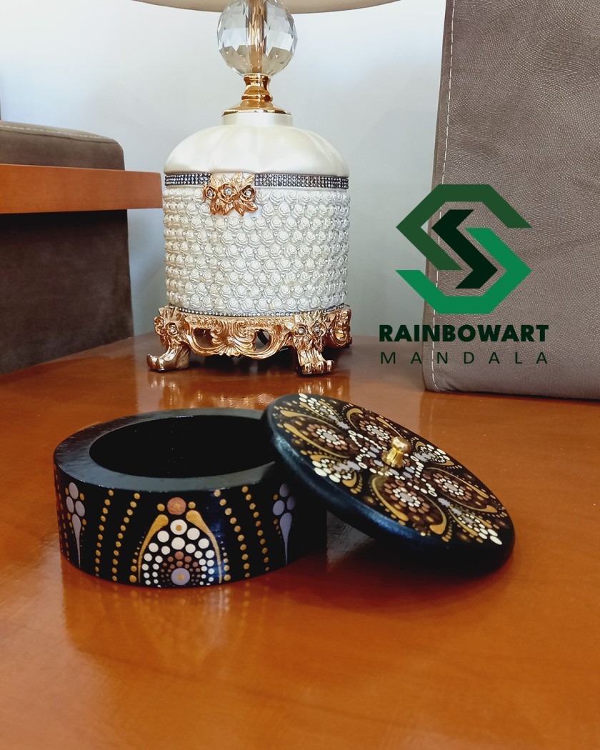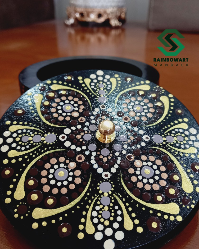 این قندان چوبی دستساز با بدنه مشکی مات، طراحی شده به سبک مدرن و ساده، با نقوش دات ماندالا به رنگهای طلایی و کرمی که روی بدنه و درب آن هماهنگ کار شده است. طراحی لوکس و چشمنواز این قندان باعث شده بهعنوان یک قطعه دکوری شیک و کاربردی برای انواع فضاها، از میز پذیرایی گرفته تا محل کار و دکور خانه، استفاده شود.