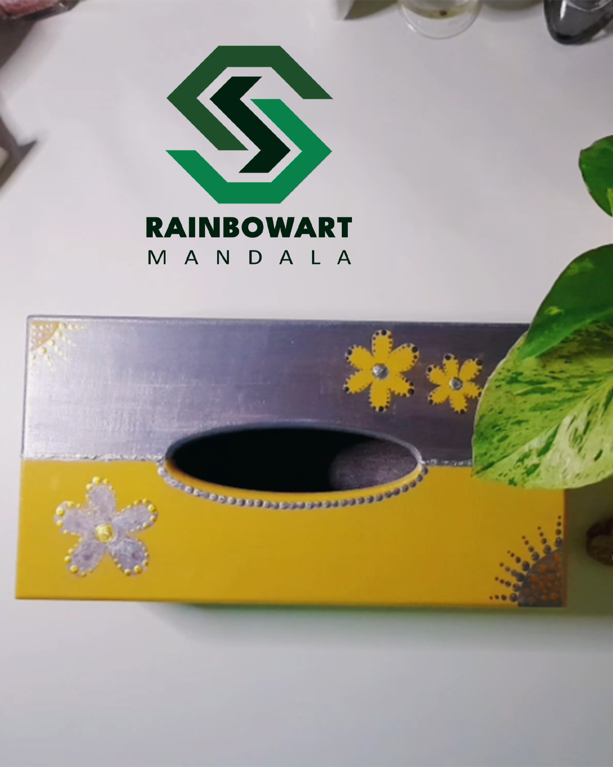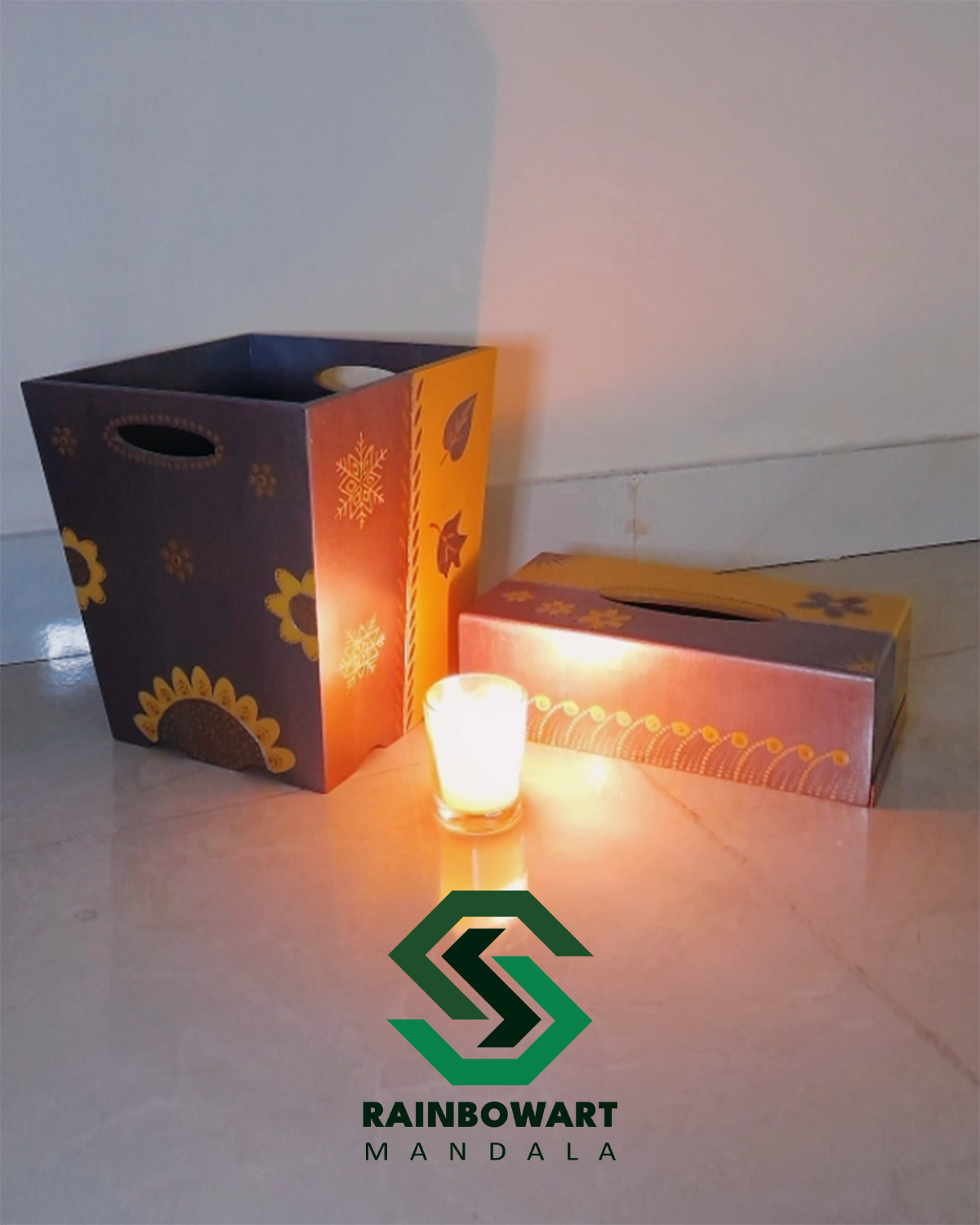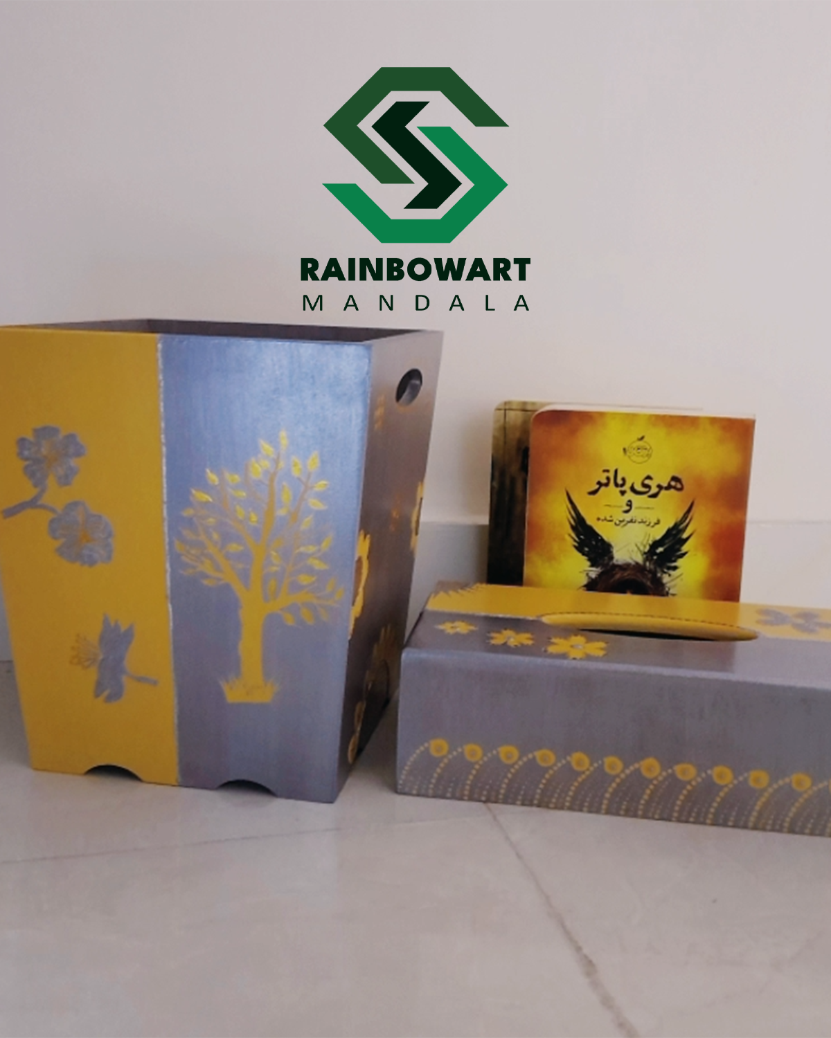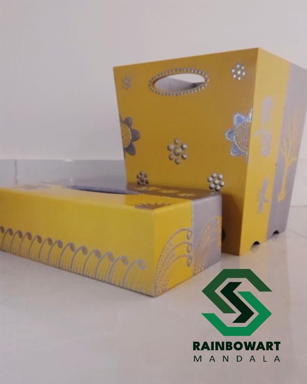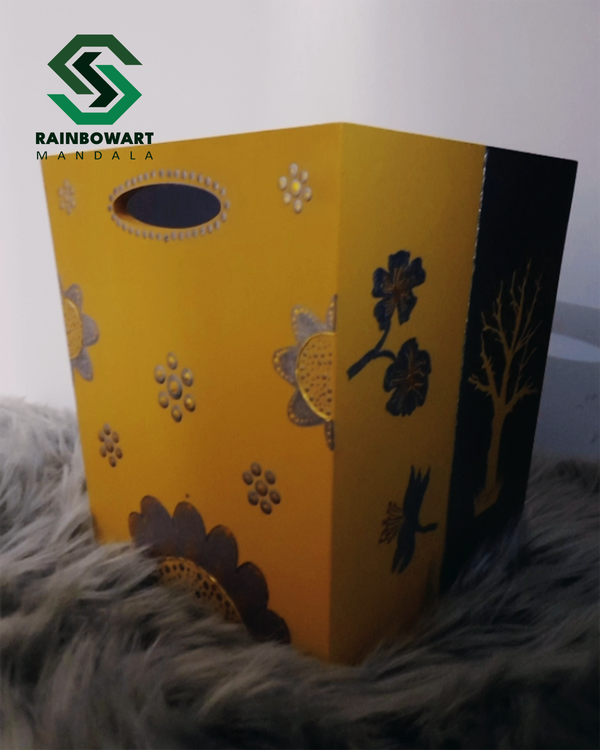 ست جادستمالی و سطل آشغال چوبی طلایی و نقره ای | طرح ماندالا و دات ماندالا